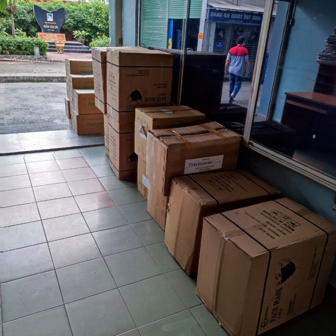 Trưa và chiều nay 6x nhận 500 bộ đồ bảo hộ cấp 2 (7 món), 12 thùng Vitamin C (100 hộp/thùng) + 50 hộp lẻ,  25 thùng Khẩu trang y tế (50 hộp/thùng). Hai bữa trước thì nhận 40 thùng Dung dịch sát khuẩn (24 bình/thùng)