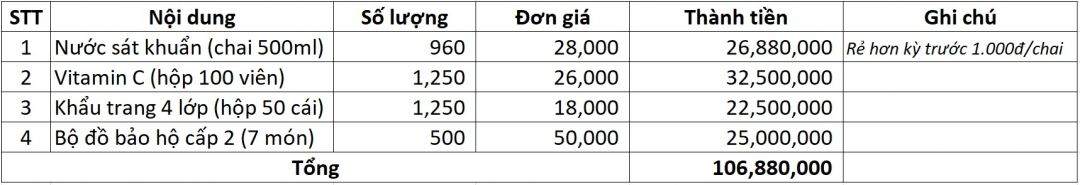 Qua nói chuyện với anh Mẫn trưởng nhóm thì hiện nhóm PUN PNF đang rất cần đồ bảo hộ cho các anh tài xế, toàn nhóm có khoảng 86 người, thay phiên nhau thì mỗi ngày có 50-60 anh tài chạy chở hàng, mỗi người cần 2 bộ đồ cho 1 ngày, như vậy mỗi ngày nhóm cần 100-120 bộ. Với tinh thần tương trợ lẫn nhau, Vịt đề xuất diễn đàn mình hỗ trợ nhóm PUN PNF đồ bảo hộ để các anh yên tâm hơn trong hành trình chuyển hàng khắp nơi ở Sài Gòn, các anh là mắt xích quan trọng giúp các bếp từ thiện và bà con khu phong tỏa.