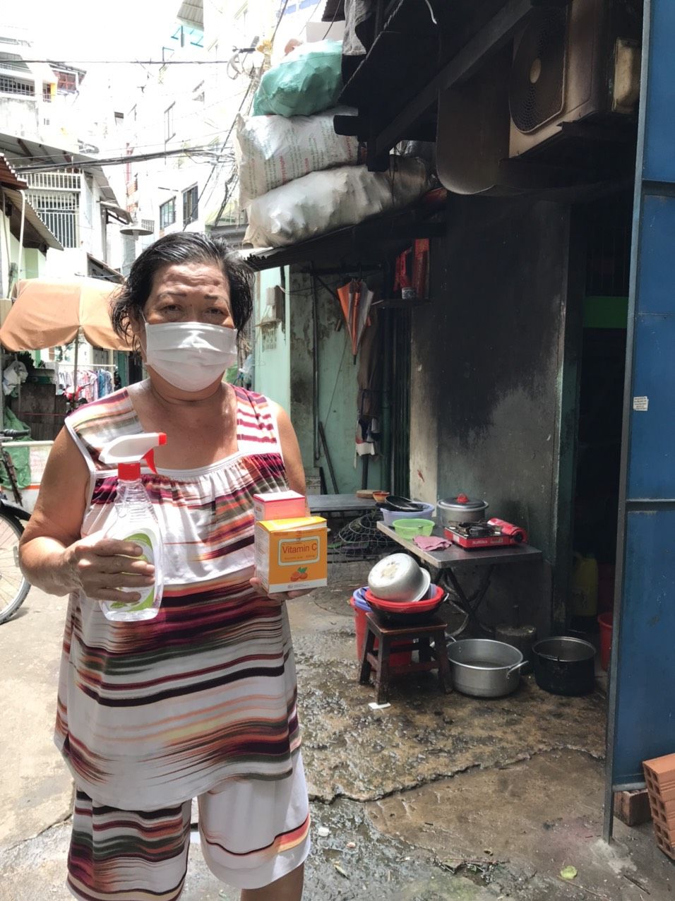 Chúng ta sẽ trao 43 phần quà gồm khẩu trang, nước sát khuẩn, vitamin C, vitamin 3B hỗ trợ cho bà con tăng cường sức đề kháng vượt qua dịch bệnh.