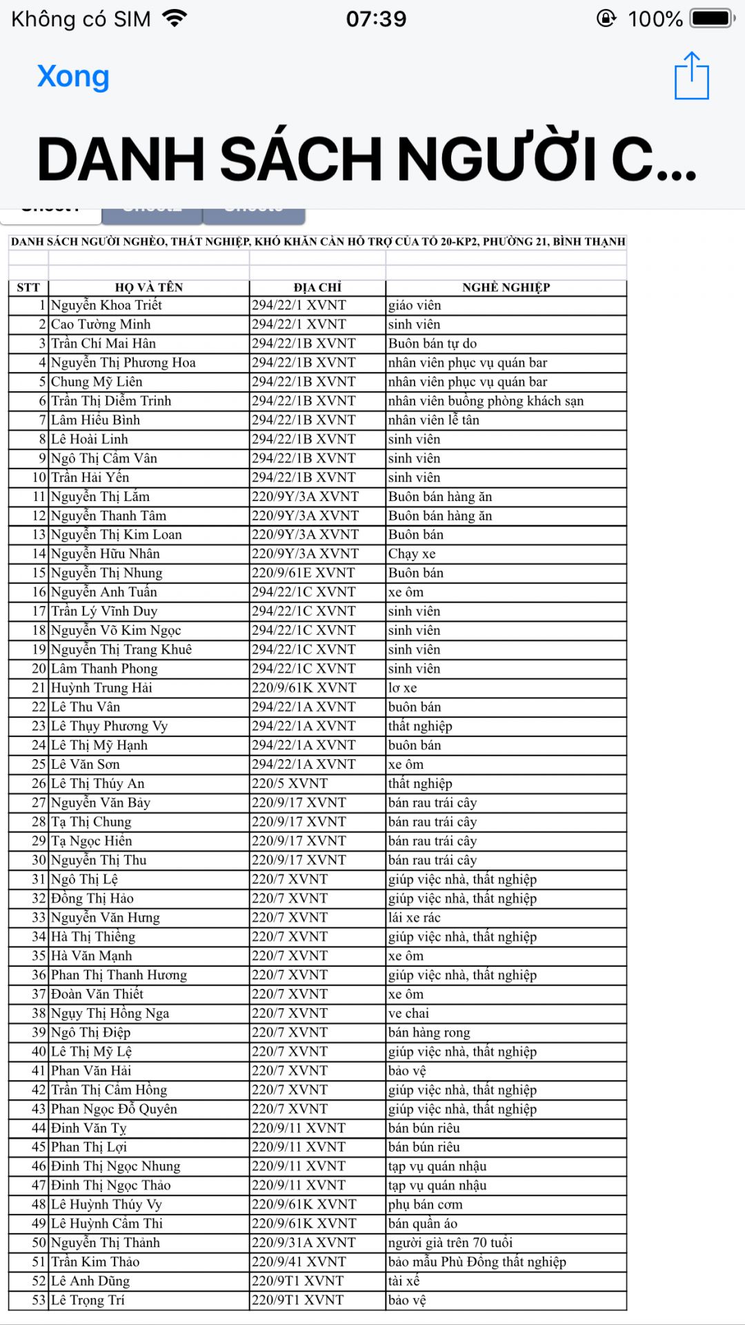 Loannguyen gửi lại danh sách 60 hộ trong đó 46 hộ bổ sung số điện thoại, 14 hộ còn lại nằm trong khu phong tỏa nên chưa xin được ạ (do bạn Vỹ ngại khu vực nhiều F0 và F1 nên không dám vào xin số điện thoại, lúc sáng có nhân viên y tế vào test nên nhờ ghi giúp được danh sách). Vậy cả nhà xem xét và quyết định giúp họ số lượng phần quà như thế nào nhé.