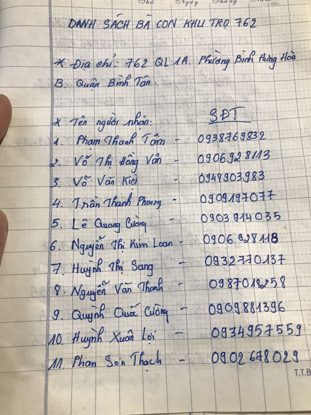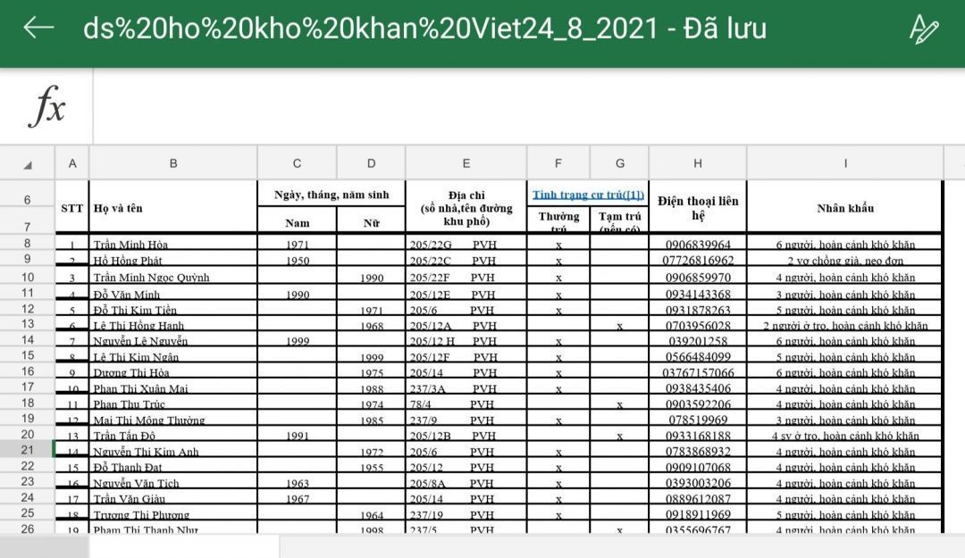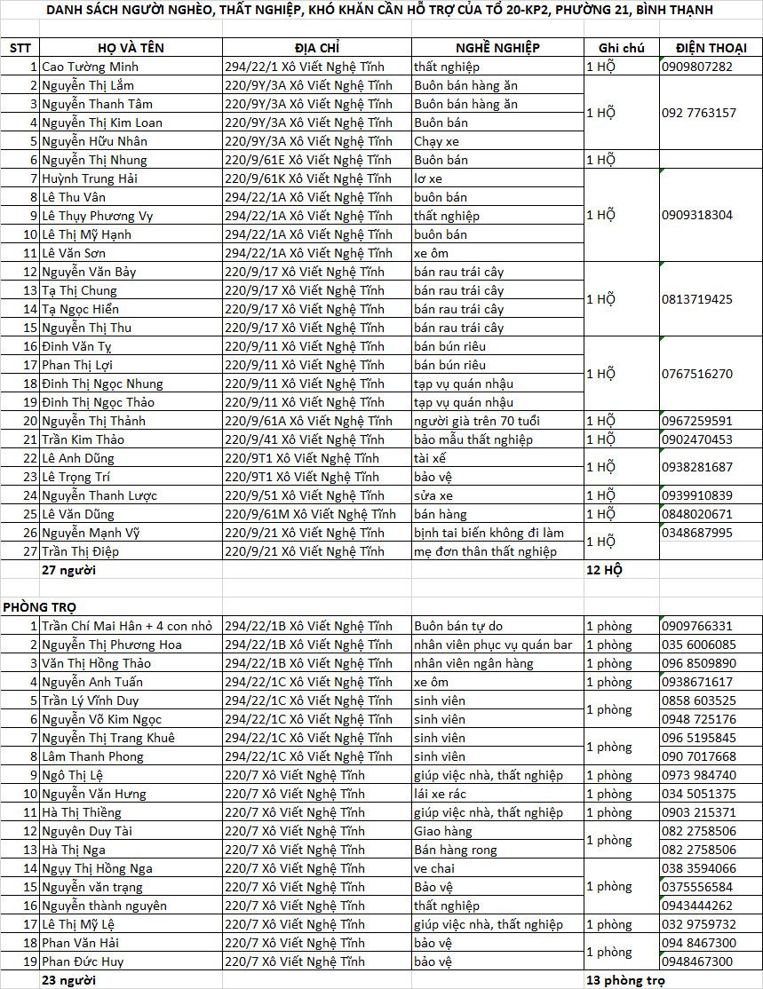 Tieuhuongduong gởi lại danh sách cập nhật những hộ khó khăn, những người ở trọ hiện đang có mặt tại địa phương kèm theo số điện thoại
