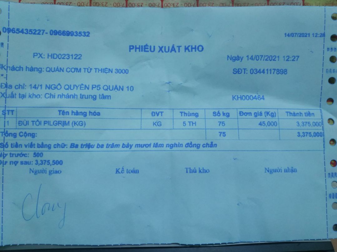 - Mua 75kg đùi gà tỏi: 45,000đ/kg x 75kg = 3,375,000đ