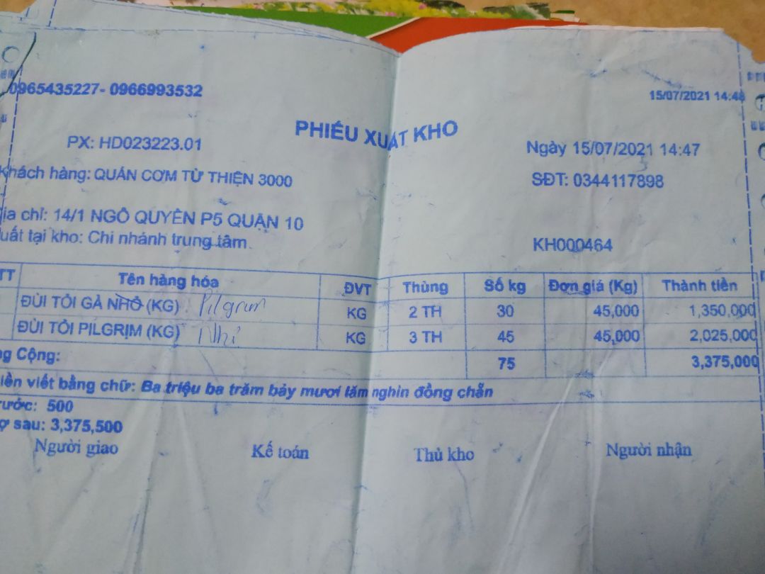 - Mua 75kg đùi gà tỏi : 45,000đ/kg x 75kg = 3,375,000đ