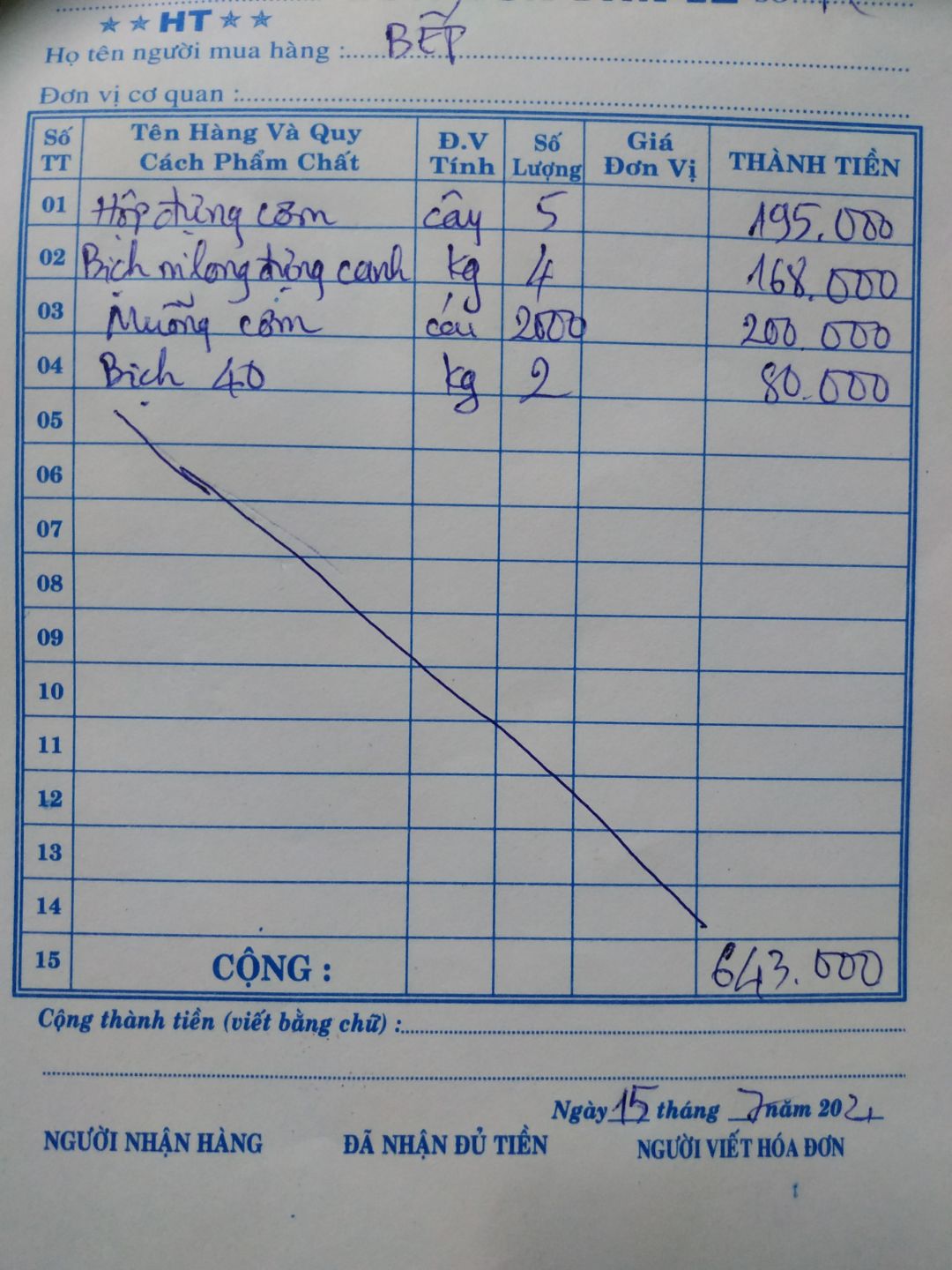 - Mua 14 cây hộp đựng cơm: 39,000đ/cây x 14 cây = 546,000đ