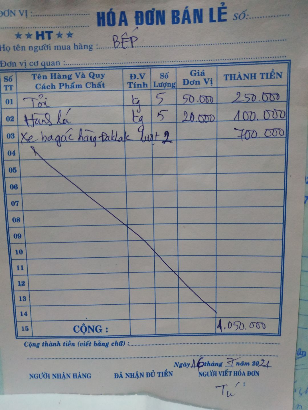 - Tiền vận chuyển rau củ Dak Lak từ An Sương về quán cơm: 350,000đ/chuyến x 2 chuyến = 700,000đ