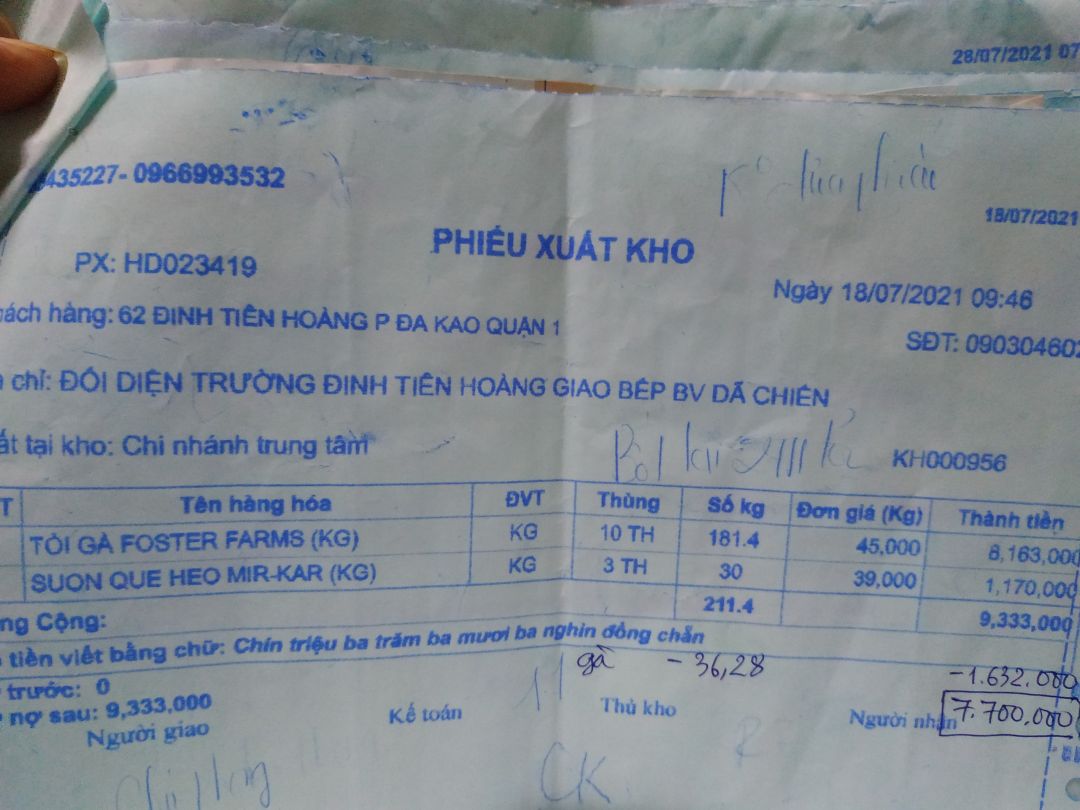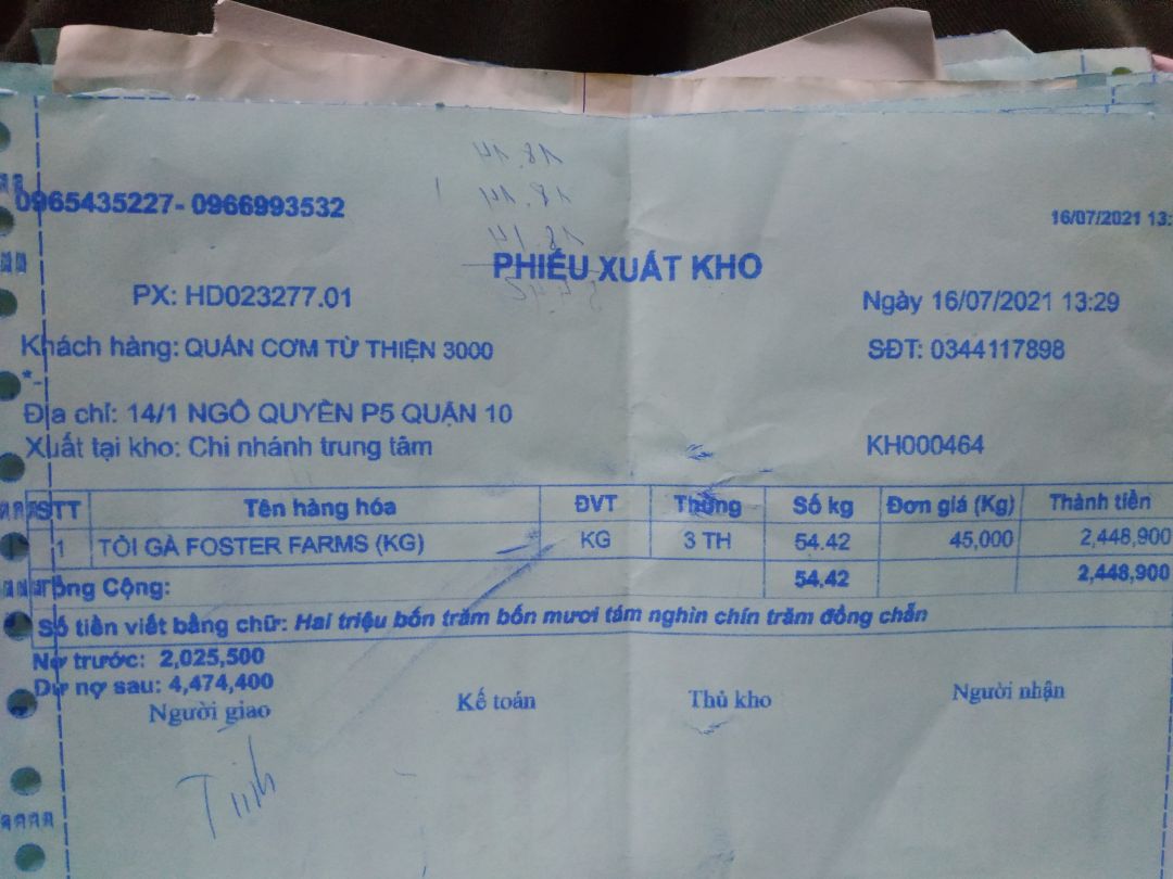 - Mua 54.42kg đùi gà tỏi : 45,000đ/kg x 54.52kg = 2,448,900đ
