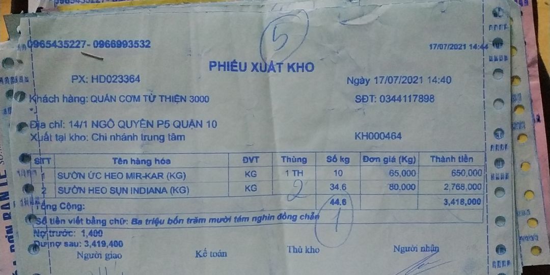 - Mua 50kg sườn que heo: 39,000đ/kg x 50kg = 1,950,000đ