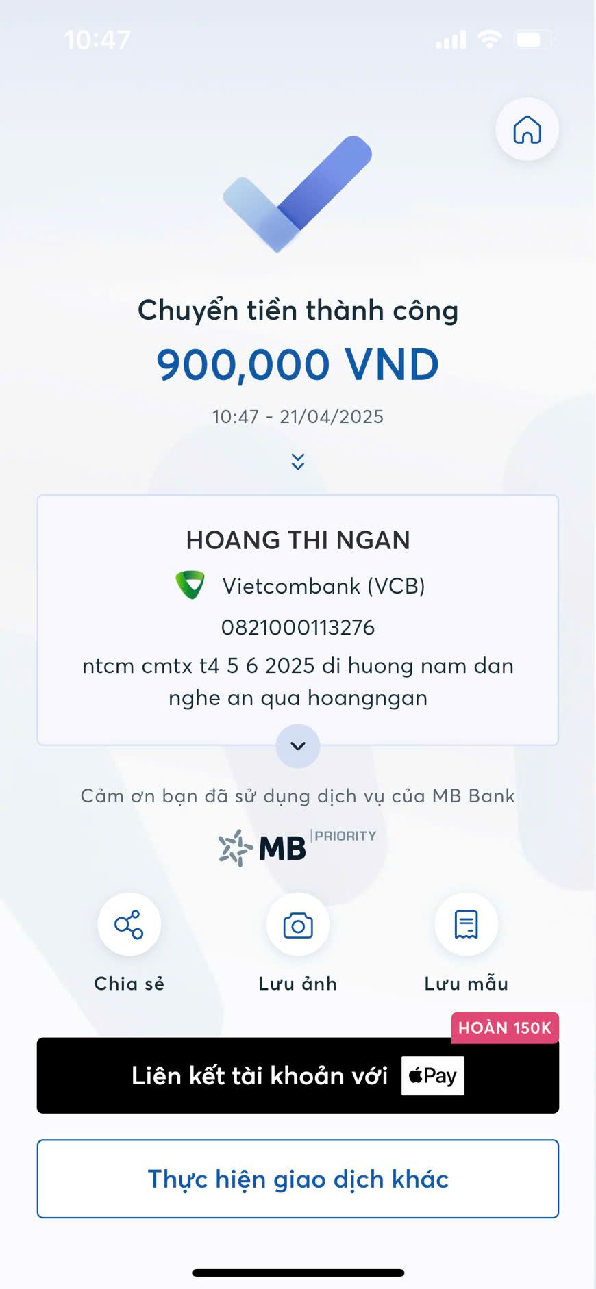 @trangvitgioi : Em xuất quỹ NTCM chuyển 900,000₫ tới @Hoàng Ngân để bạn ấy trung chuyển tiền CMTX từ tháng 4 đến hết tháng 6/2025 tới Gia đình chị Hưởng dùm nhé.