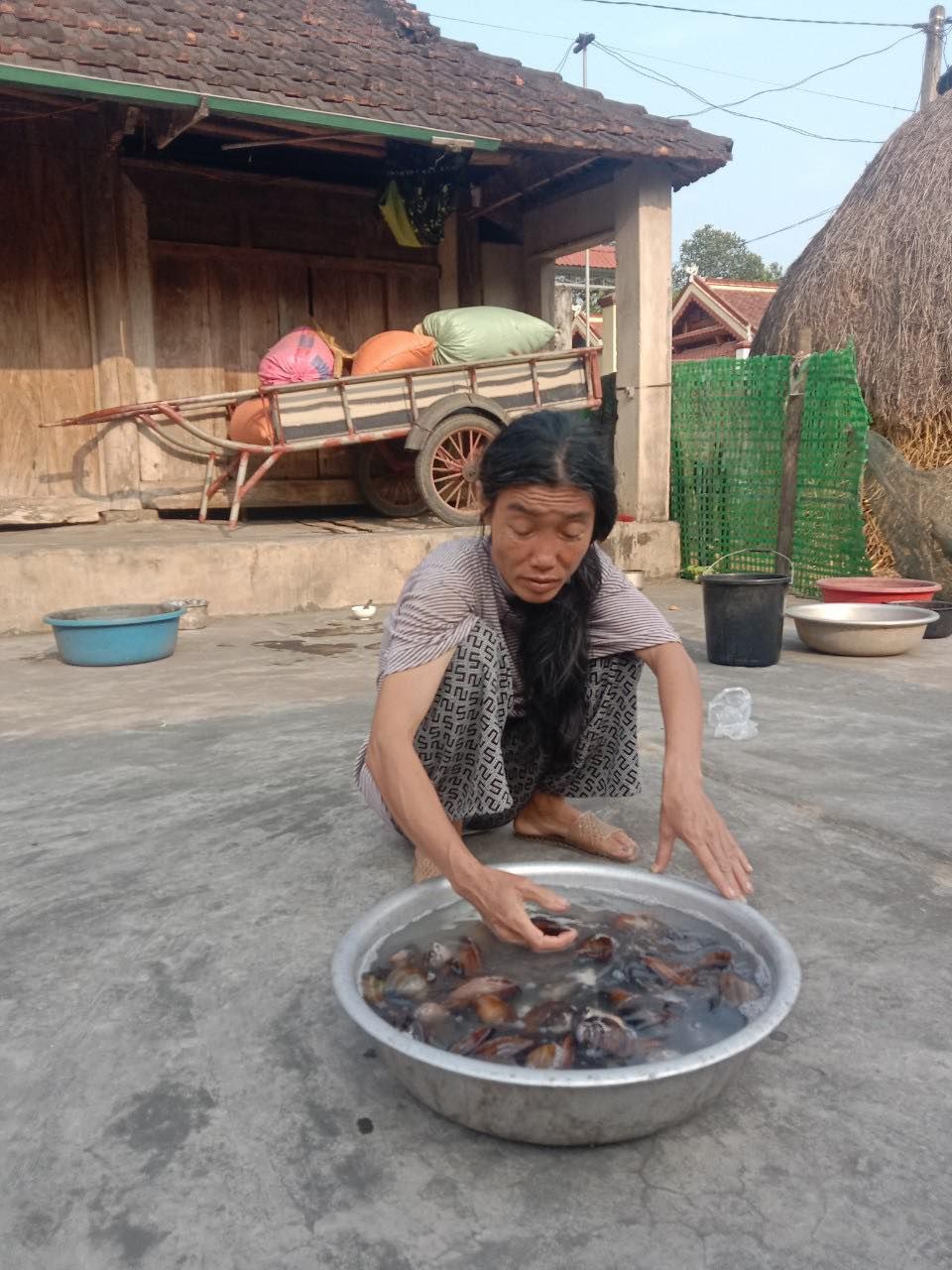 Hoàn cảnh gia đình con bà Thiêng tụi con đã xác minh, hoàn cảnh này tội ạ. Hai dì Nguyễn Thị Thuận và Nguyễn Thị Cảnh hiện đang sống tại xã Minh Sơn, huyện Đô Lương, tỉnh Nghệ An, cả hai đều bị tâm thần nhưng người chị là dì Thuận bị nặng hơn ạ, không còn biết gì nữa . Khi TV tới xác minh thì gặp dì Cảnh đang ngồi rửa hến để nấu cháo. Còn nhà thì khoá trái cửa lại nói khoá lại để khỏi chị chạy đi lung tung , khi mở cửa ra thì một mùi khai bốc lên nồng nặc, một người phụ nữ ngồi một góc nói lảm nhảm một mình , trên thân không có một mảnh vải che thân. Da bọc xương , gầy gò rất tội. Trước khi mẹ còn sống thì cũng có người chăm lo nên cũng không đến như thế này, chừ bà mất rồi còn người em nói tỉnh cũng không phải tỉnh mà dại cũng không phải dại, nhưng cũng không bình thường lắm . Lúc tụi con xin chụp giấy tờ sổ trợ cấp thì không cho chụp, giữ khư khư nói đưa các cô chụp tui lấy sổ mô mà nhận tiền. Nói chụp để xin quà cho cũng nhất nhất không có đưa cho ai , thâm tâm dì cũng biết đó là nguồn sống duy nhất của hai chị em nên lúc trước được dặn giấu cẩn thận nên đố ai mà mượn được . Phỉnh mãi không được nên tụi con cũng đành bó tay, nhưng qua hỏi thăm bà con trong xã thì được biết hai dì có được một khoản trợ cấp là 1.260.000 nghìn đồng, của dì chị là 720.000đ , dì em là 540.000đ . Số tiền này hàng tháng phải mua thuốc an thần hơn 500.000đ và số tiền còn lại là khoảng hơn 700.000đ hai chị em nuôi nhau. Sống nhờ khoản tiền đó và thỉnh thoảng có sự giúp đỡ của bà con. Tính ra với tầm 700k một tháng , mỗi ngày hơn 20.000 cho hai người ngày ba bữa thì cũng may ở quê còn có bà con láng giềng , người cho bó rau người cho quả trứng. Tính ra một dở ăn có khoảng 6-7.000 cho 2 người sáng, trưa, tối cũng đủ biết đói no thế nào . Mà cũng không cần tính nhìn dì chị với da bọc xương đó cũng hiểu là cuộc sống hai chị em thế nào rồi , hoàn cảnh hai dì còn có một người em trai gần đó, làm nghề cửu vạn. Là người em cùng cha khác mẹ với hai dì, chú này tỉnh táo hơn chút có vợ con nhưng gia cảnh cũng không khá giả hơn là bao. Cũng có được căn nhà nhưng cũng chẳng có gì giá trị, ngoài ra chú cũng còn một bà mẹ bị mù tức là mẹ kế của hai dì . Trước bà cũng ở bên nhà bên này nhưng do tối ngủ không được , cùng với việc dì Thuận bị bệnh vậy nên chừ bà về ở bên nhà con trai. Mấy giấy tờ tụi con chụp được là nhờ bà mẹ kế cất dùm nên mới chụp được , riêng sổ nhận trợ cấp thì dì Cảnh giữ nên có nói cách nào cũng không cho mượn chụp. Làm việc với người tỉnh đôi khi còn khó nên làm việc với người dại nửa tỉnh nửa khôn còn khó gấp bội lần. Lúc mở cửa vào nhà một người điên cũng sợ lắm, nhiều người còn la hét đánh đập người, may sao dì Thuận lúc này cũng không có dữ lắm chỉ ngồi một góc nói lảm nhảm, tội ạ.