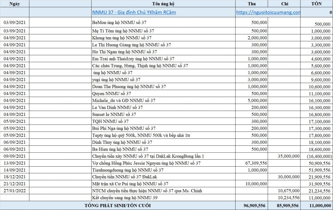 Vịt gửi lại tổng hợp ủng hộ của NNMU37, số dư sau cùng là 11.000.000đ sau khi đã chuyển 10,234,556 vào NNMU 39 tiếp theo. Số tồn này Vịt đề xuất hỗ trợ các NNMU 40, NNMU 41, NNMU 42 bị thiếu theo link từng topic. Nhờ tổ điều phối cho ý kiến.