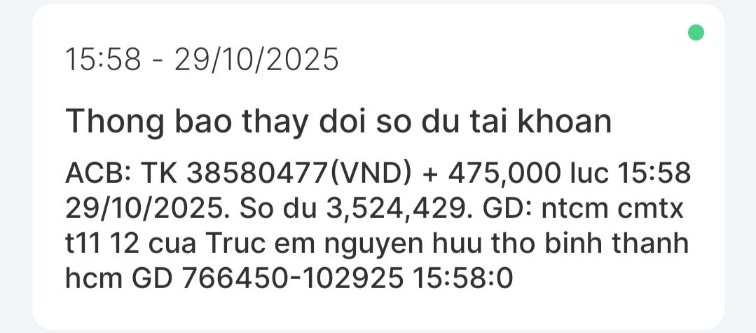 @ Anh Banbe6x: Bạn Trúc chuyển nhầm số tiền CMTX 475.000đ vào quỹ, anh 6x điều phối chuyển 475k này vào tk em Thọ giùm em luôn nhé. Thanks anh.