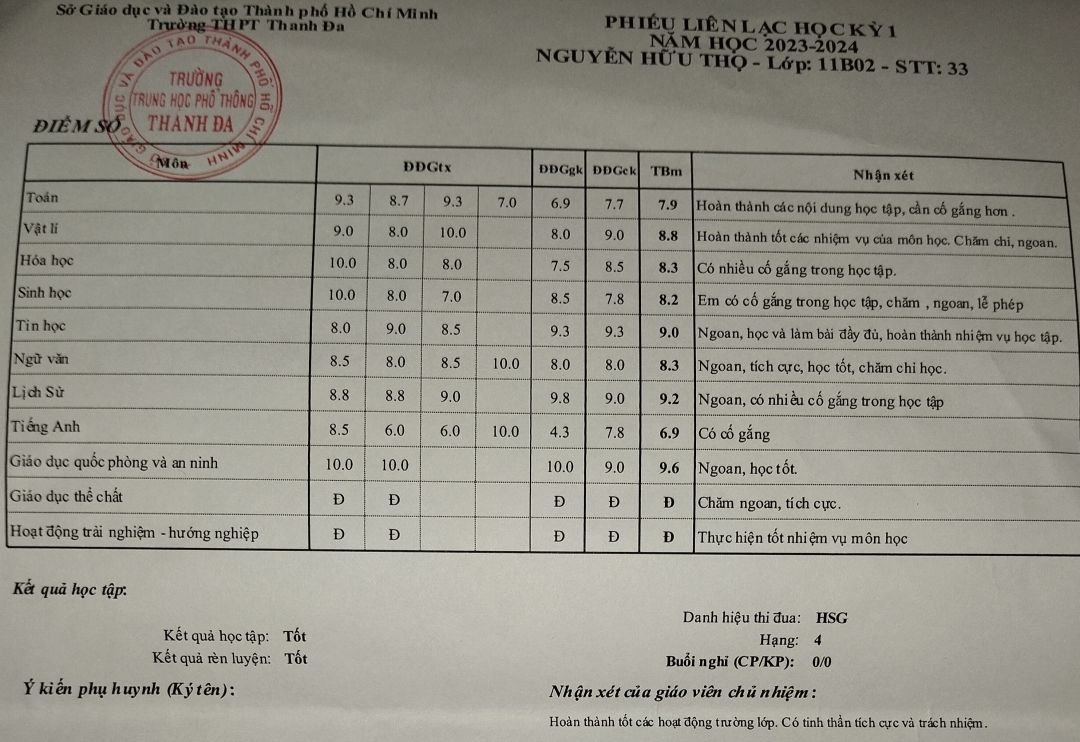 Dạ con xin chào cả nhà ạ con tên là Nguyễn Hữu Thọ vừa qua con và em con cũng đã hoàn thành một nửa chặng đường của năm học thì con với em con xin gửi kết quả học tập. Con và em xin cảm ơn cô Thắm và quán cơm 2.000đ đã đồng hành và giúp đỡ tụi con ạ. Em con được học sinh khá nhưng do nhà trường thu lại sổ liên lạc nên con không thể gửi lên ạ.