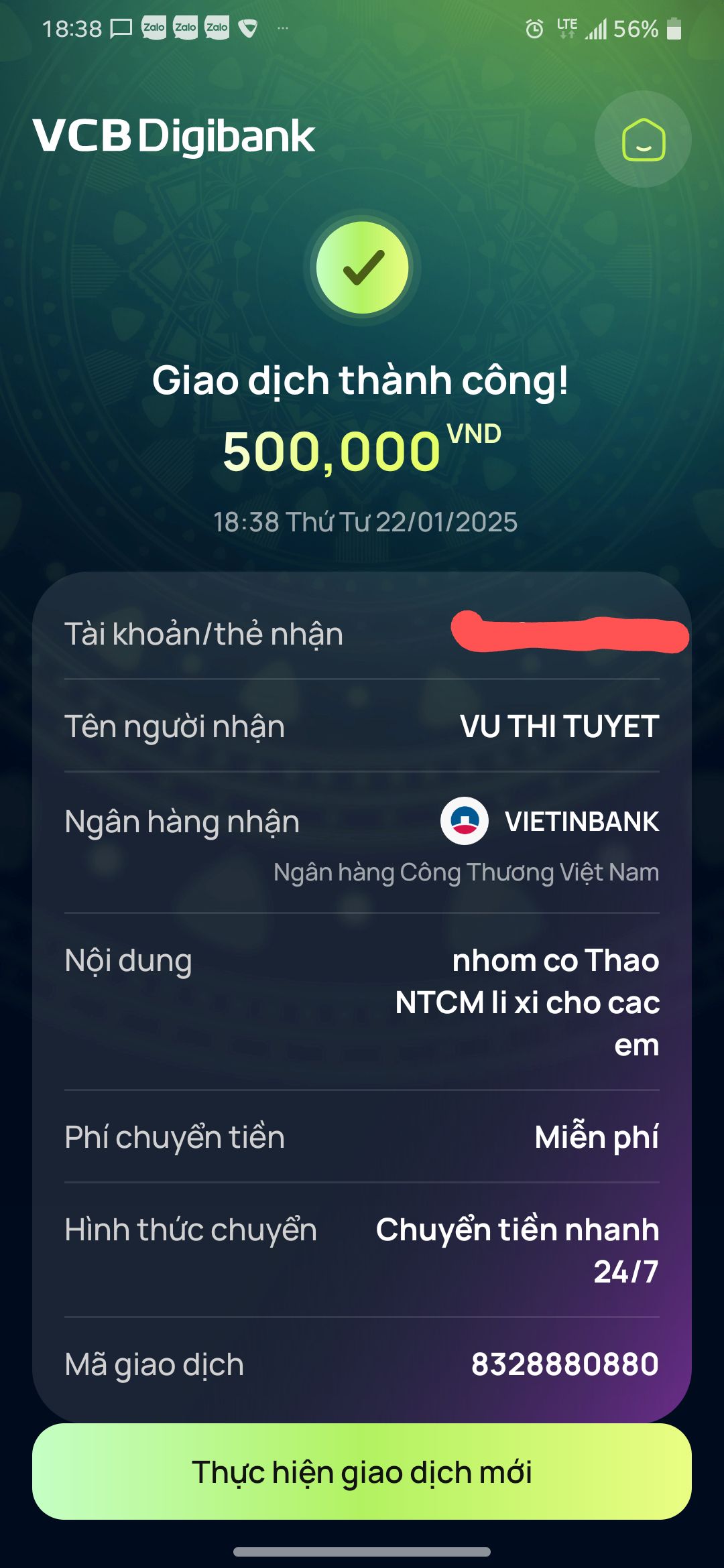 Nhờ Lá tiếp tục trung chuyển tiền dùm nha. Cảm ơn Lá nhiều.