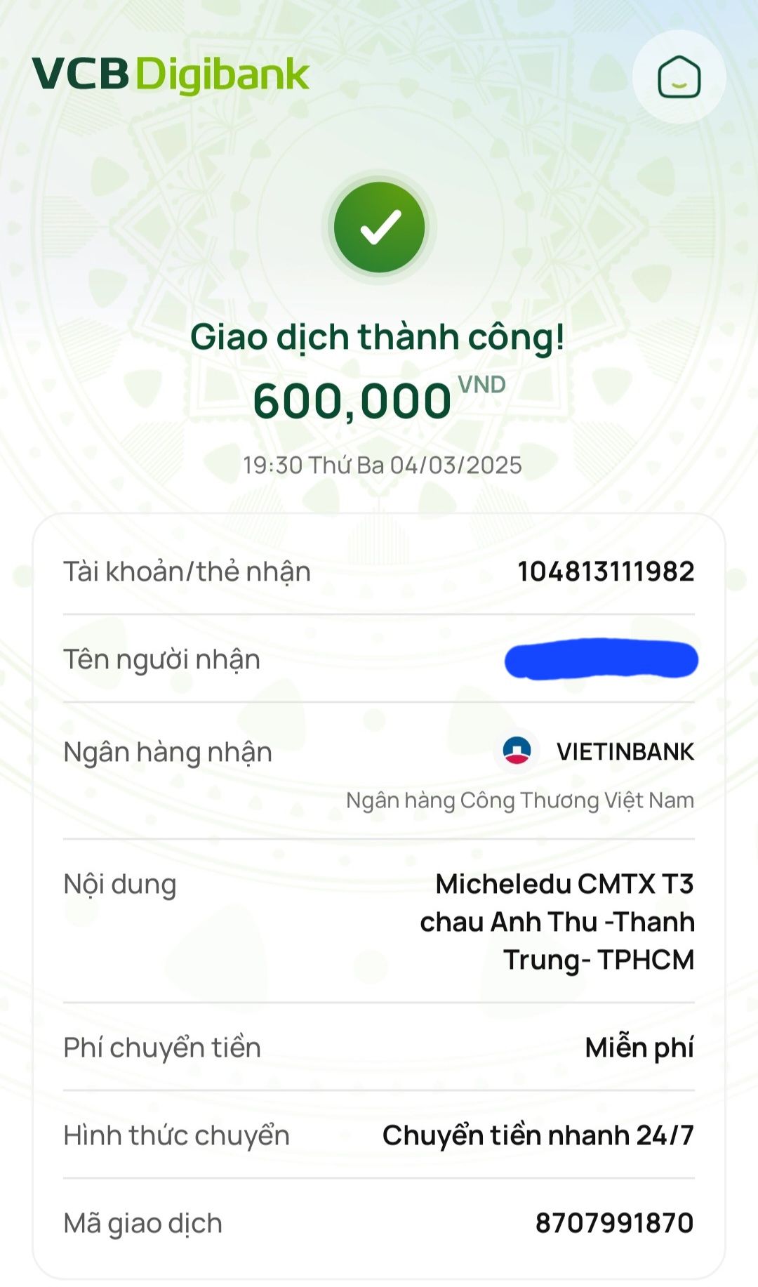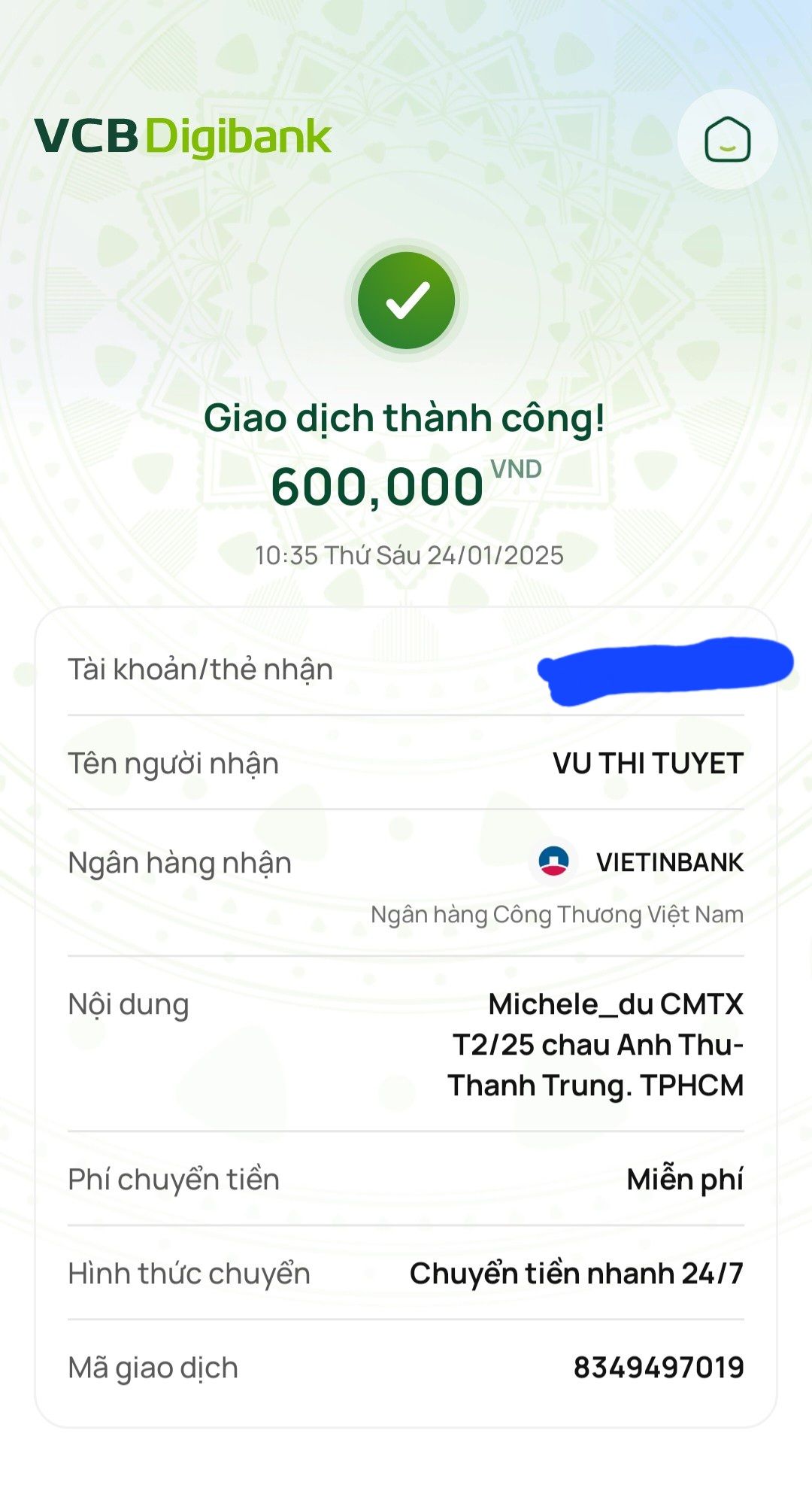 Lathuvang đã trung chuyển CMTX T02/25 đến cháu Anh Thư- Thành Trung của cô Michele_du và GĐ.