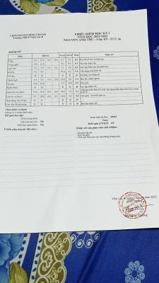 điểm cuối học kỳ 1.Nay con gửi cho các cô chú xem cùng con ạ. Công việc của mẹ con cũng tạm ổn ,hang ngày mẹ đi làm dẫn em con đi cùng .Còn con thì đã lớn tự đi xe điện tới trường rồi ạ .Mẹ con bớt phải lo về việc đưa đón con đi học rồi ạ.