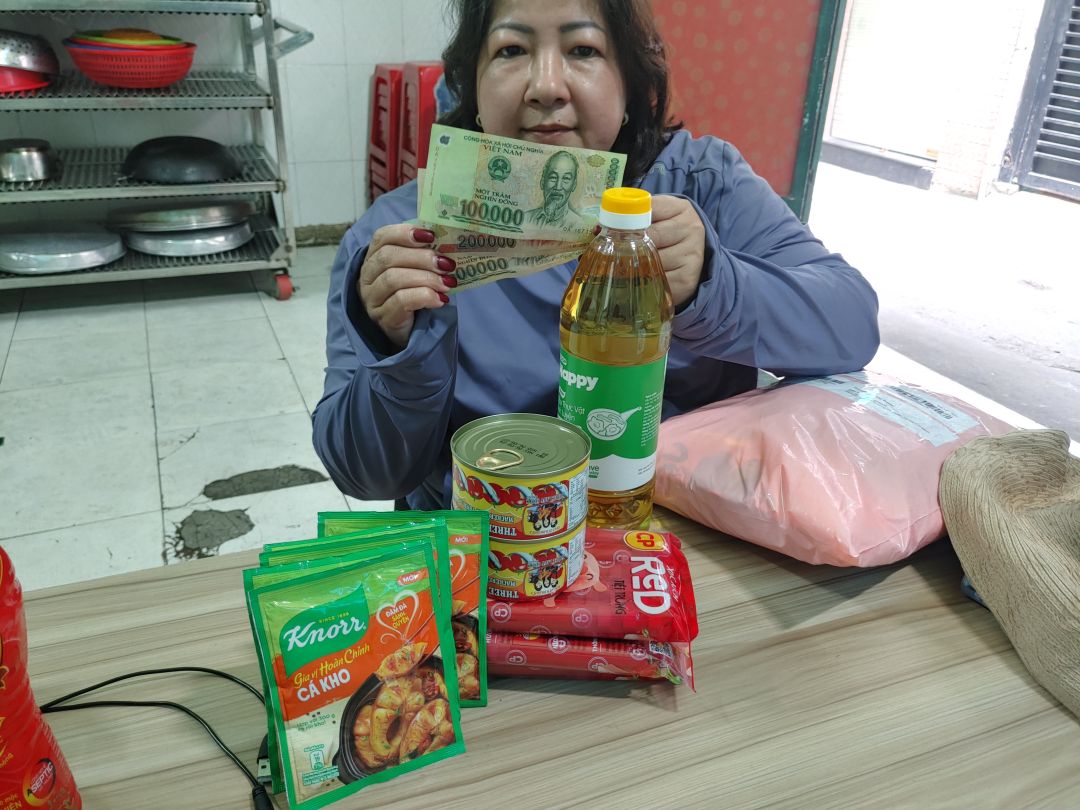 Đợt này chị Dung xin nhận 1 chai dầu ăn 1lit, ngoài ra, letuantu có gửi thêm 2 bịch xúc xích, 2 hộp cá mòi, 4 gói hạt nêm 25gr.