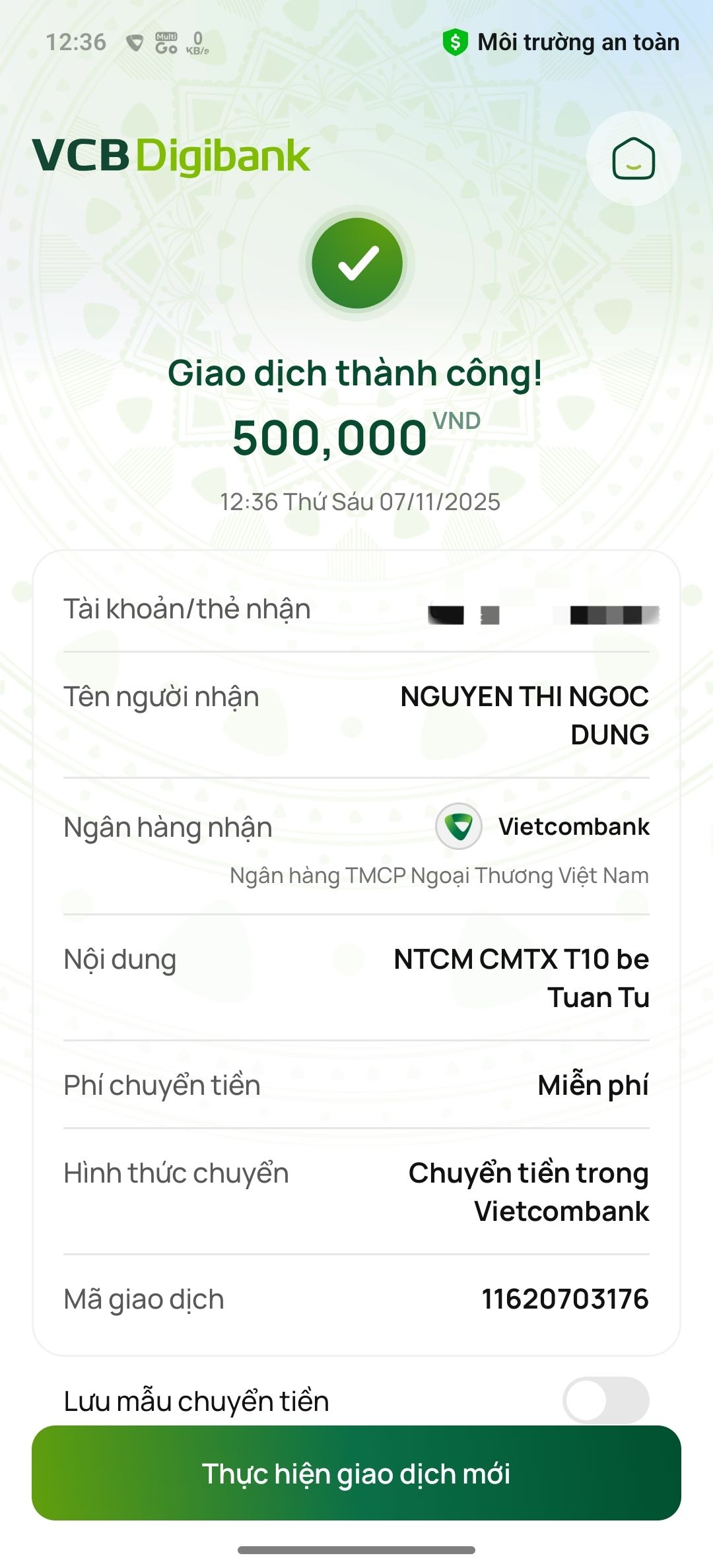Hoàn cảnh của cháu Tuấn tú đã hết khoản cmtx từ tháng 11, rất mong nhận được sự chung tay của cả nhà, sau vài lần kêu gọi vẫn chưa nhận được sự hỗ trợ nên sau 72 giờ tiếp theo vẫn chưa có sự hỗ trợ mới, chúng ta xuất quỹ NTCM để cmtx cho hoàn cảnh của cháu Tuấn Tú, trong 3 tháng từ tháng 11 đến tháng 01/2026, mỗi tháng 500.000đ, rất mong nhận được sự quan tâm hỗ trợ của cả nhà