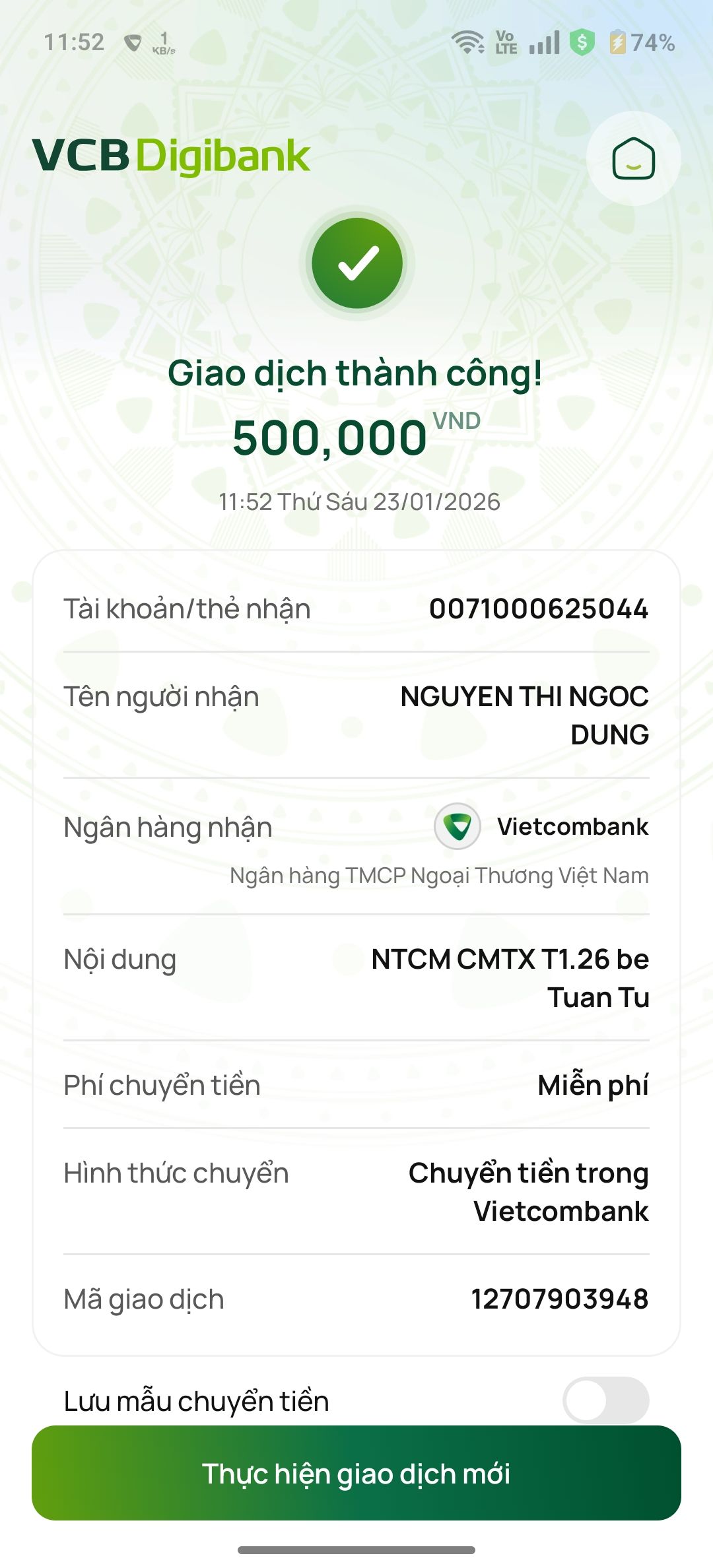 Hoàn cảnh của cháu Tuấn tú đã hết khoản cmtx từ tháng 11, rất mong nhận được sự chung tay của cả nhà, sau vài lần kêu gọi vẫn chưa nhận được sự hỗ trợ nên sau 72 giờ tiếp theo vẫn chưa có sự hỗ trợ mới, chúng ta xuất quỹ NTCM để cmtx cho hoàn cảnh của cháu Tuấn Tú, trong 3 tháng từ tháng 11 đến tháng 01/2026, mỗi tháng 500.000đ, rất mong nhận được sự quan tâm hỗ trợ của cả nhà