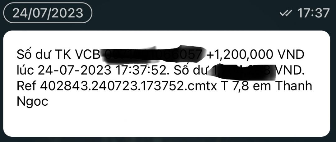 Em vừa nhận được tiền hỗ trợ 2 tháng (9+10) từ a Tú rồi ạ. Em xin thay mặt gia đình, cảm ơn các anh chị đã giúp đỡ suốt thời gian vừa qua. Bé Thanh Ngọc đã quen với việc học cấp 3, sắp tới có kết quả em sẽ cập nhật với anh chị ạ! Em xin cảm ơn anh chị rất nhiều, chúc anh chị nhiều sức khoẻ và niềm vui trong cuộc sống, cũng như trong công việc.