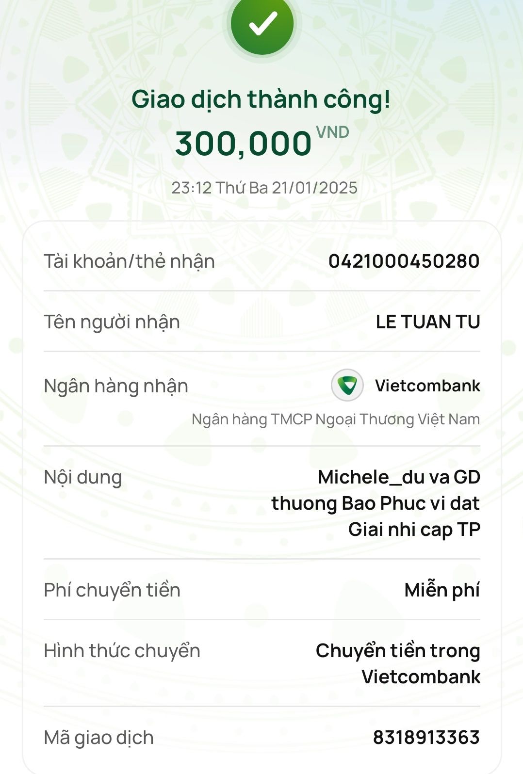Michele_du và Gia đình thưởng @Bảo Phúc 300,000₫ về thành tích vừa rồi.