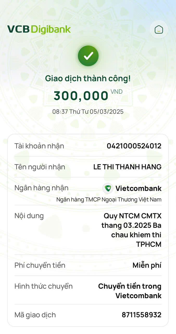Tieuhuongduong đã chuyển khoản CMTX tháng 3/2025 số tiền 300.000đ của Qũy NTCM và 300.000đ của chị Thanh Huy đến các cháu.