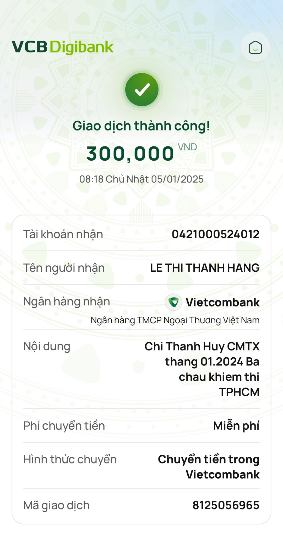Tieuhuongduong đã nhận đủ 900,000đ CMTX 3 tháng và đã chuyển 300,000đ tháng 1/2025.