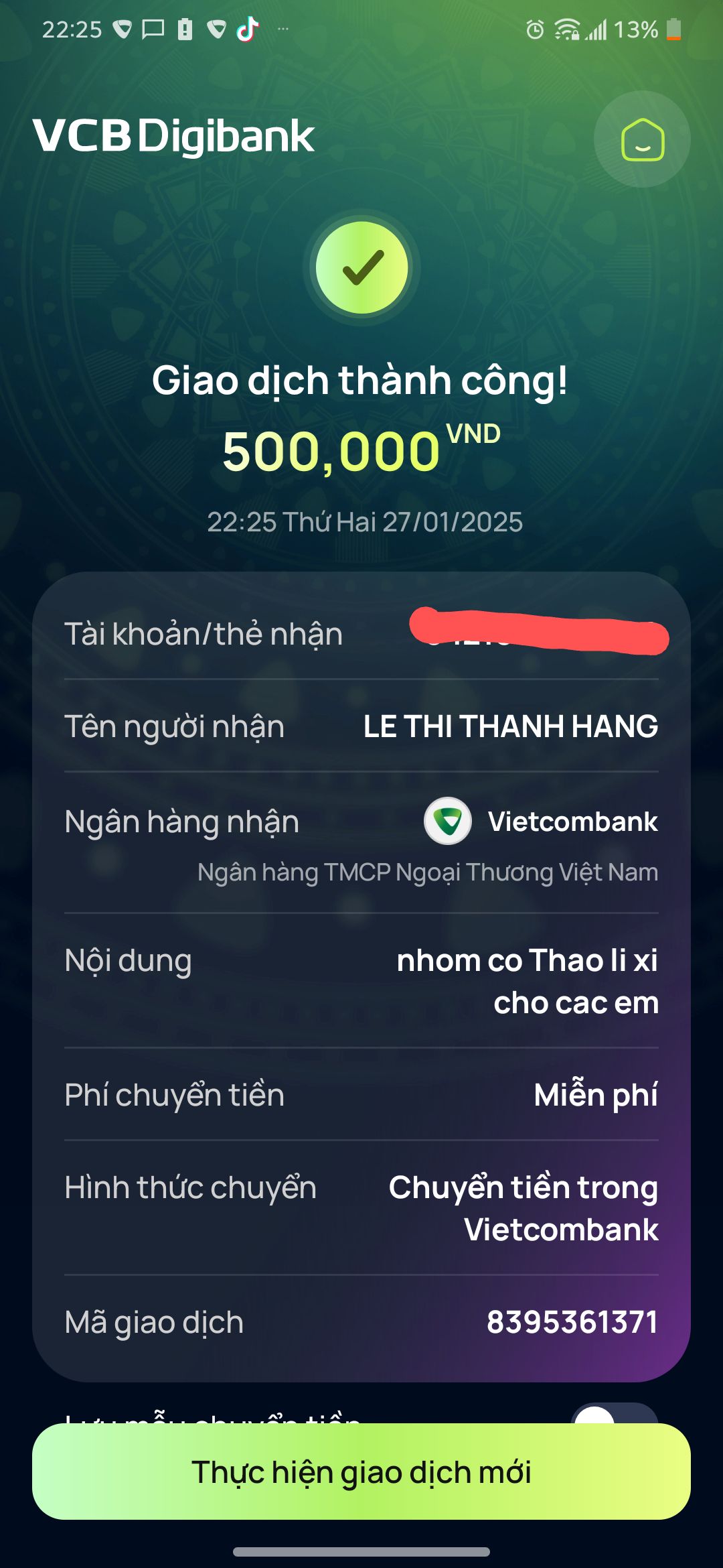 Nhóm cô Thảo lì xì 500,000đ cho các em, letuantu đã gửi tiền đến các em rồi.