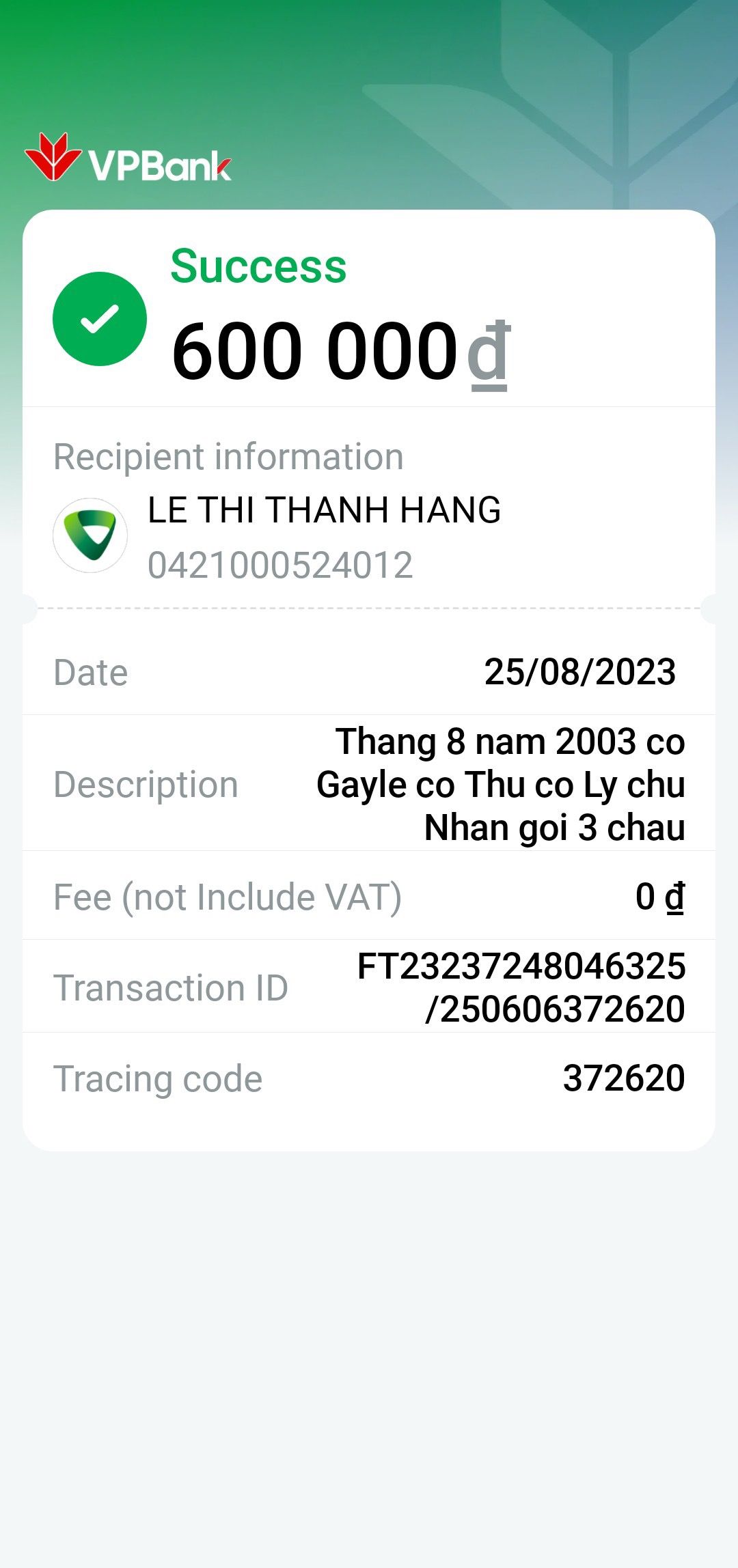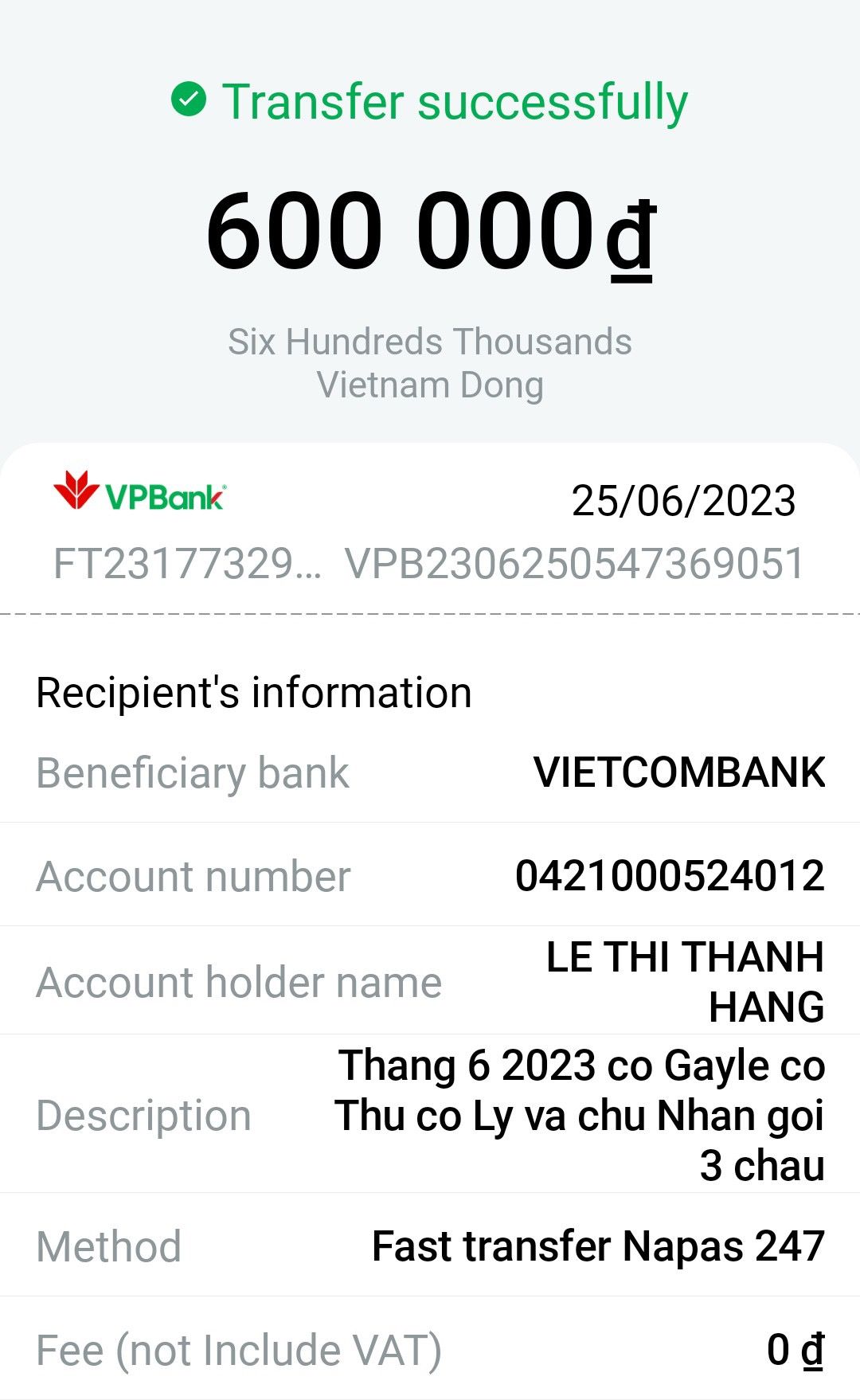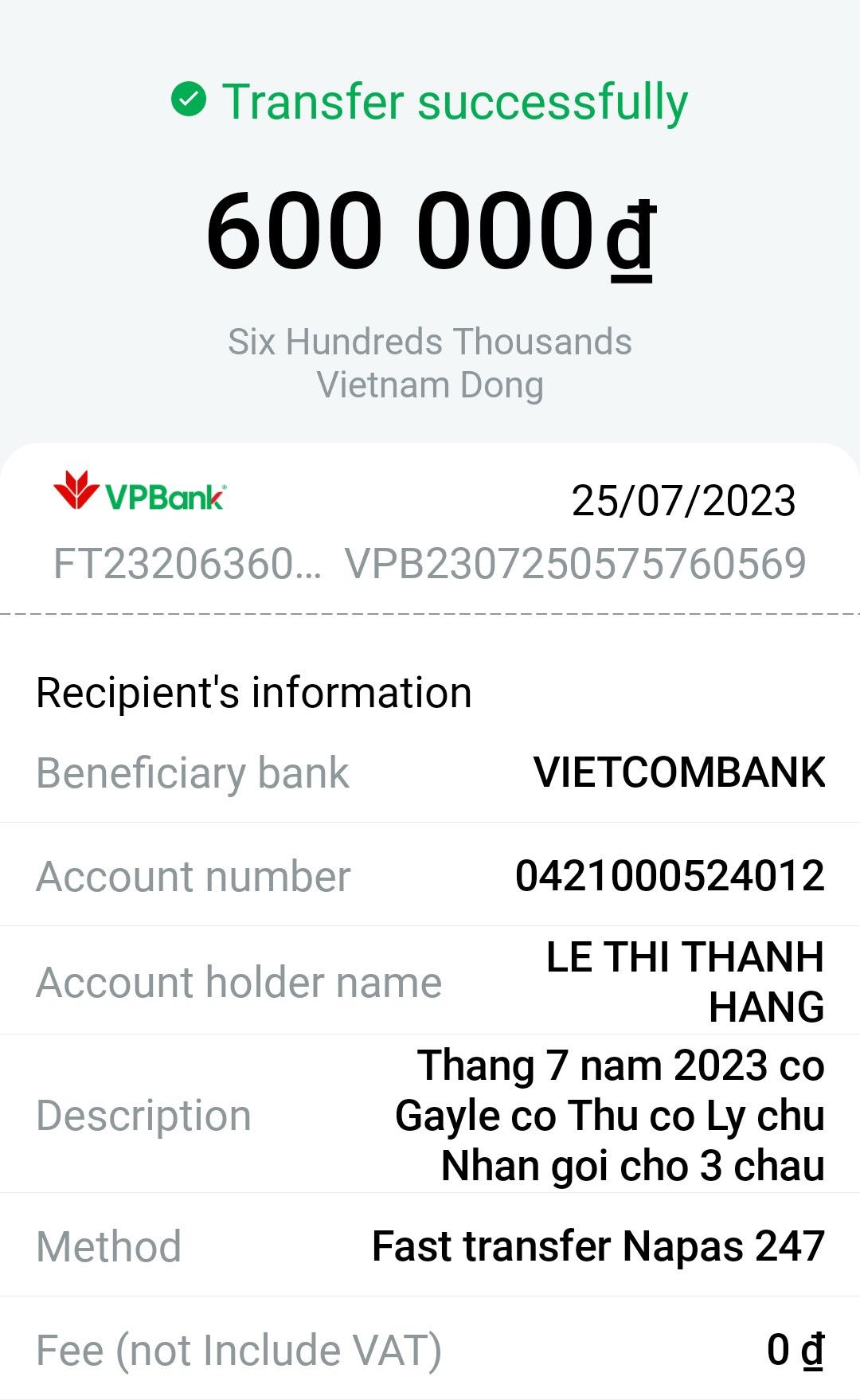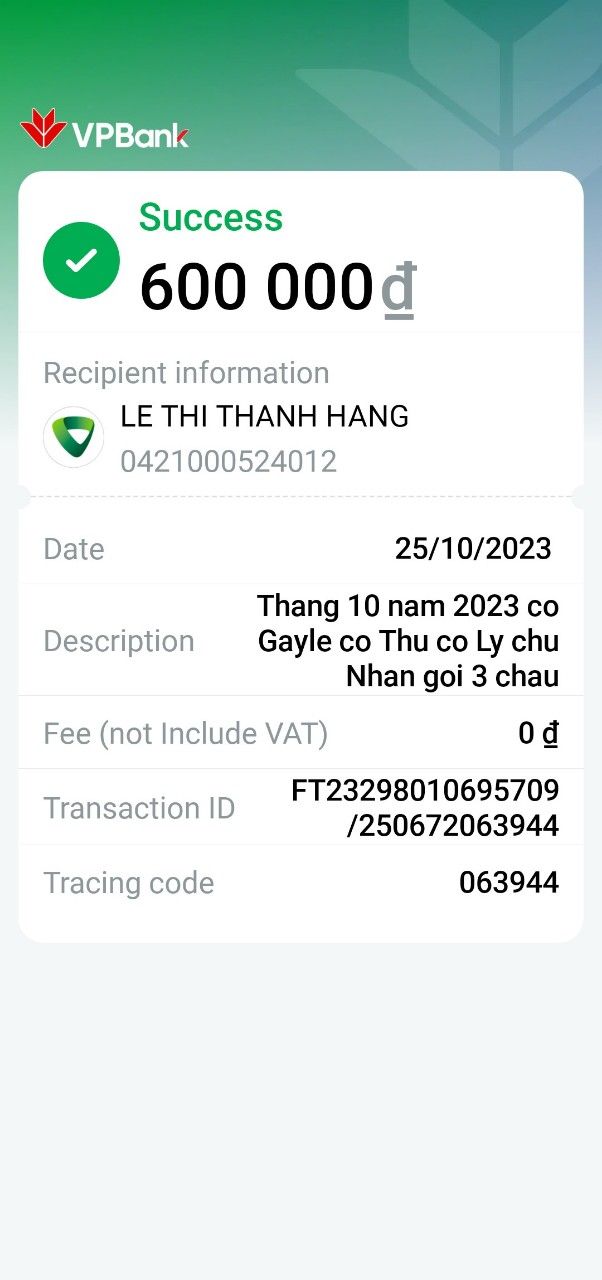 Tieuhuongduong cập nhật hình ảnh chuyển tiền CMTX 600,000VNĐ tháng 10/2023.