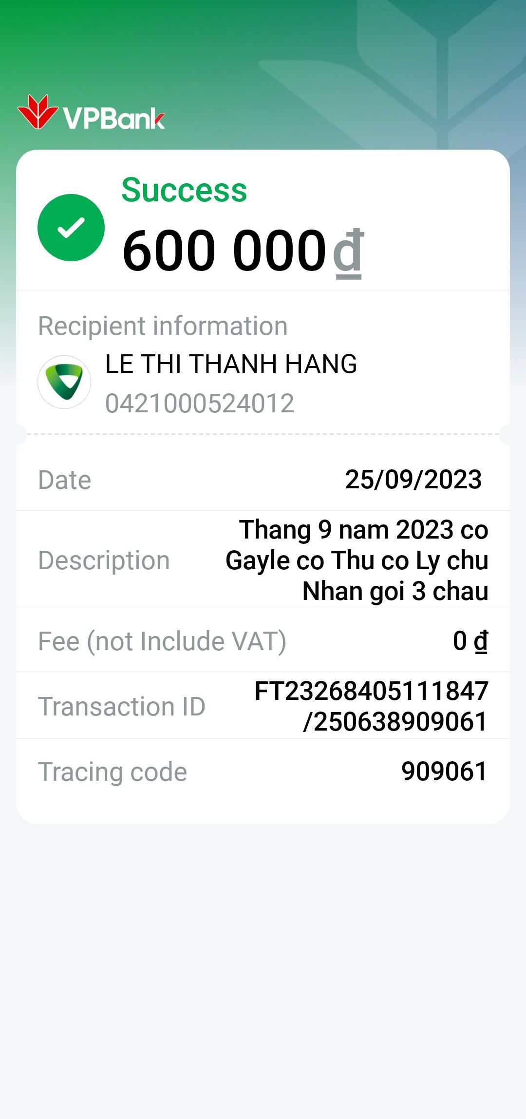 Nhóm bạn chị Ly đã chuyển khoản 600,000đ CMTX tháng 9 đến các cháu.
