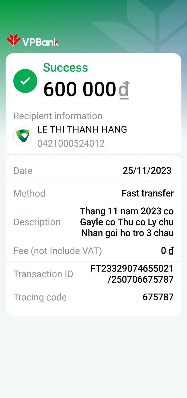 Chị Ly đã chuyển khoản 600,000đ cho các cháu CMTX tháng 11