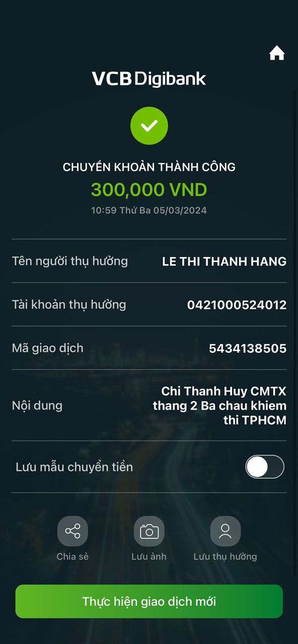 Thân gởi cả nhà hình ảnh chuyển khoản 300,000đ CMTX tháng 3/2024 đến các cháu.