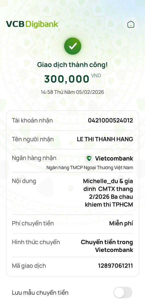 Tháng 2/2026, Tieuhuongduong đã trung chuyển 300,000đ CMTX của Michelle_du và gia đình, 300,000đ của chị Thanh Huy.