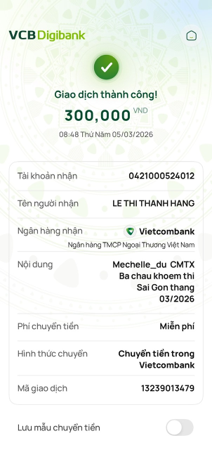 Tieuhuongduong đã trung chuyển CMTX tháng 3/2026 của Michelle_du & gia đình 300,000đ và CMTX của chị Thanh Huy 300,000đ