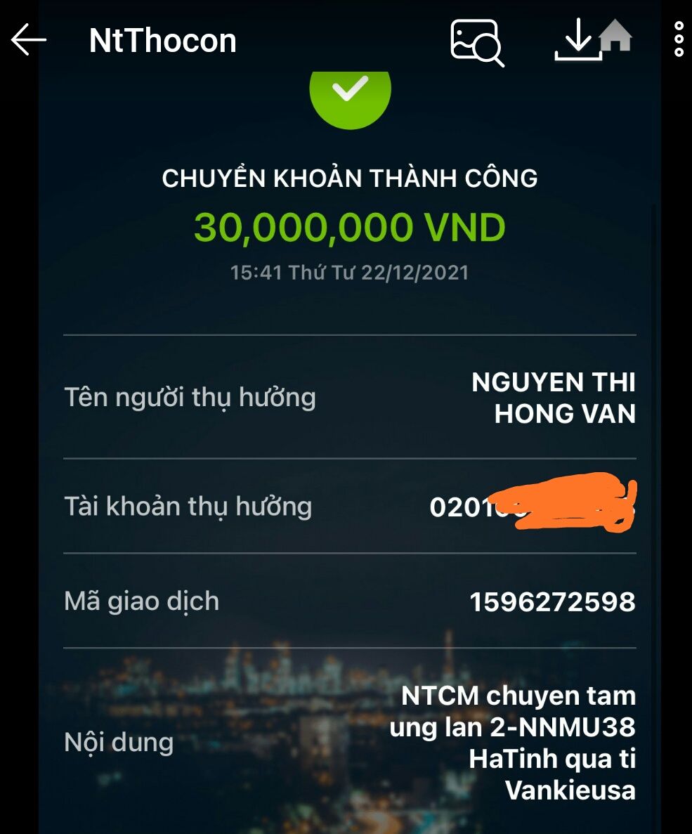 @Thocon : Em chuyển tới Vânkiêusa 30,000,000₫ tạm ứng lần 2 cho việc xây dựng NNMU số 38 dùm nhé.