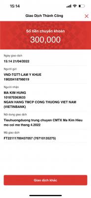 Tieuhuongduong đã chuyển cho anh Hùng, ba của em Mã Kim Hiếu 300k CMTX tháng 4 của Whoadung.