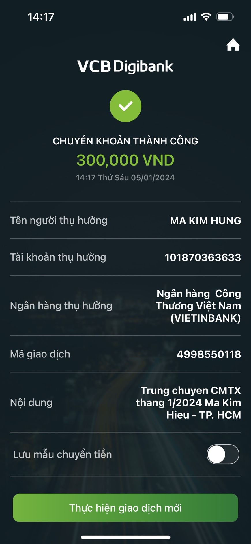 THD đã chuyển 300,000đ CMTX tháng 1/2024 đến ba cháu Hiếu.