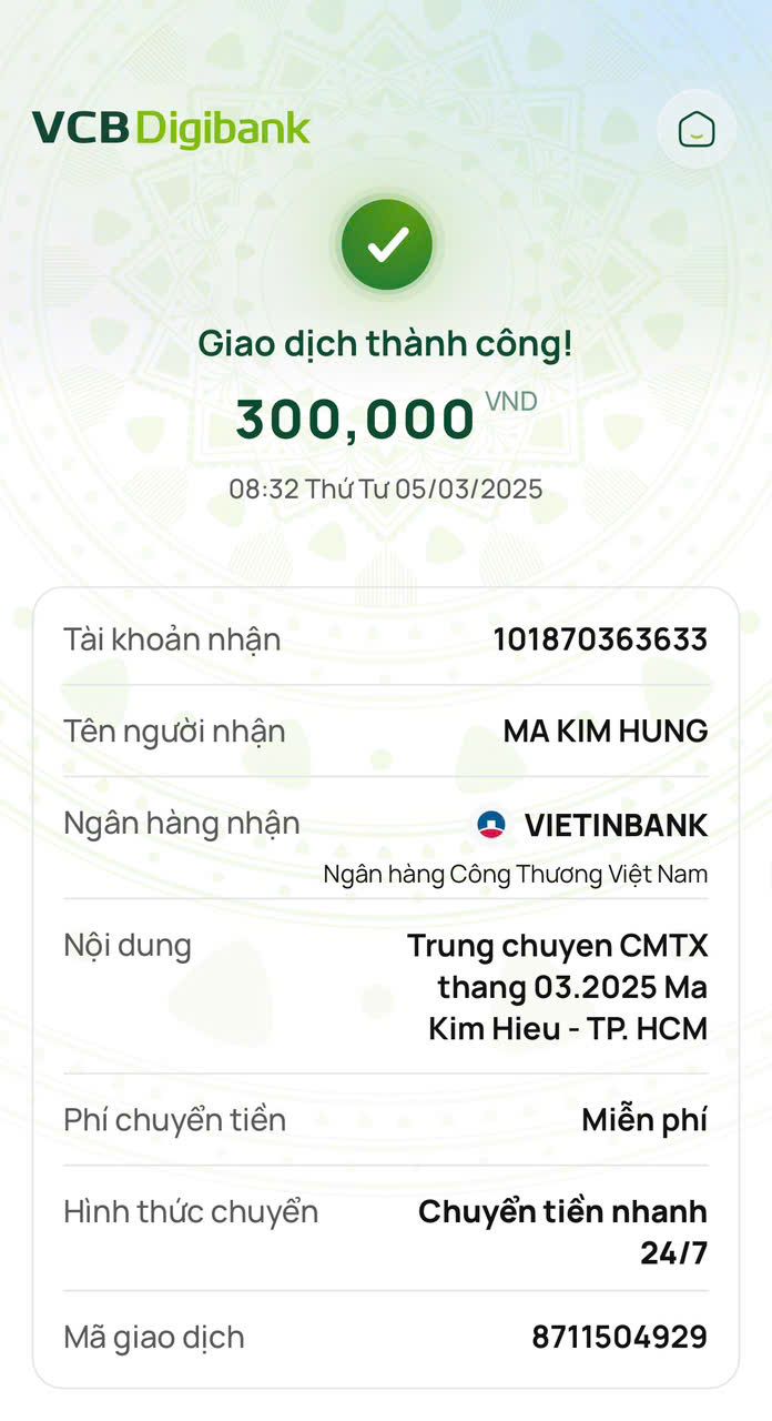 Tieuhuongduong đã chuyển vào tài khoản ba cháu Hiếu 300.000đ CMTX tháng 3/2025 của Whoadung nhé.
