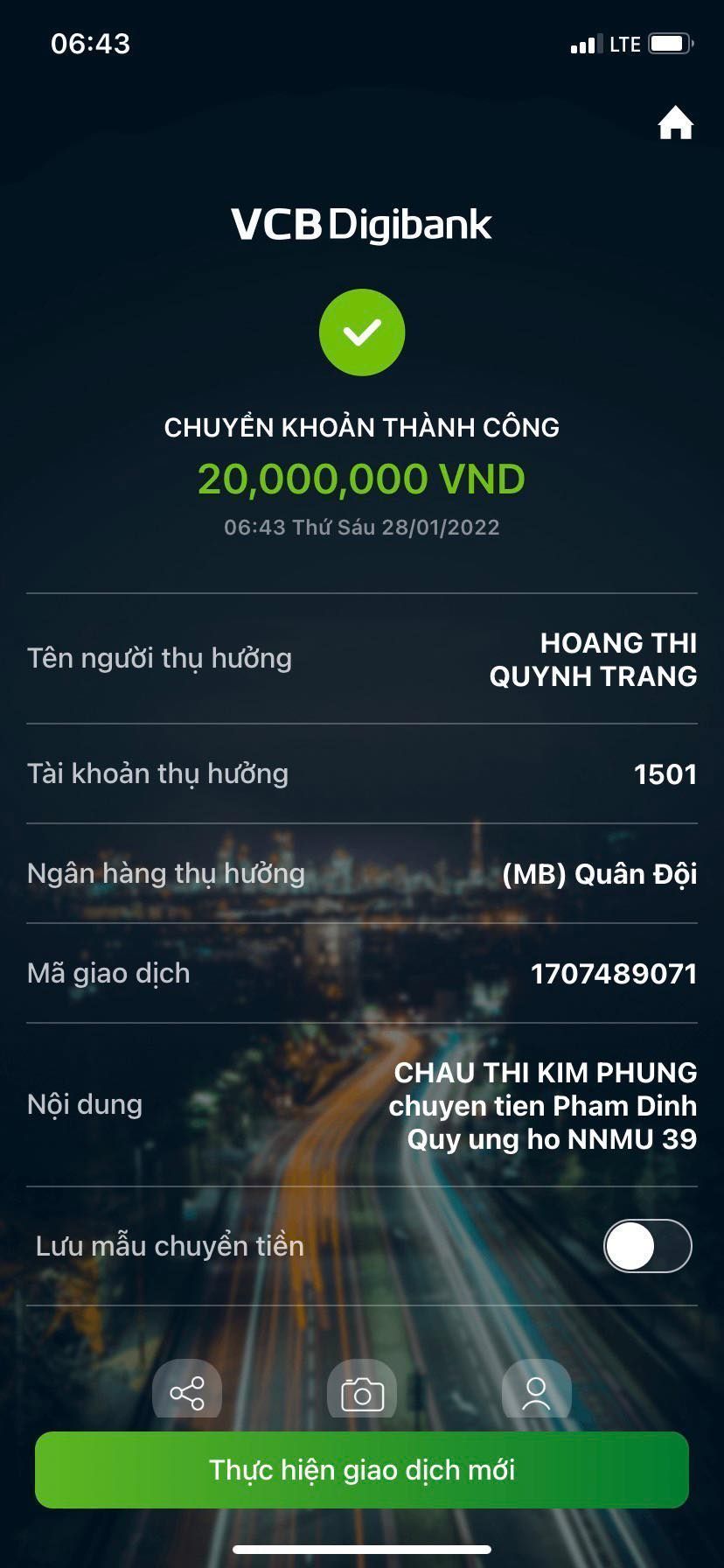 Mình đã chuyển khoản số tiền đã nhận là 39.616.500 đ cho bên vật liệu xây dựng NNMU 39 rồi cả nhà nhé. Cảm ơn cả nhà đã cùng chung tay ạ!