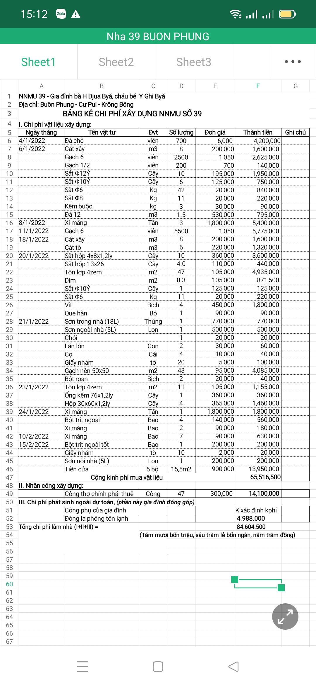 1) Chi phí xây dựng NNMU39 (Hà Chính đã đưa lên hôm trước): 79,616,500 VND