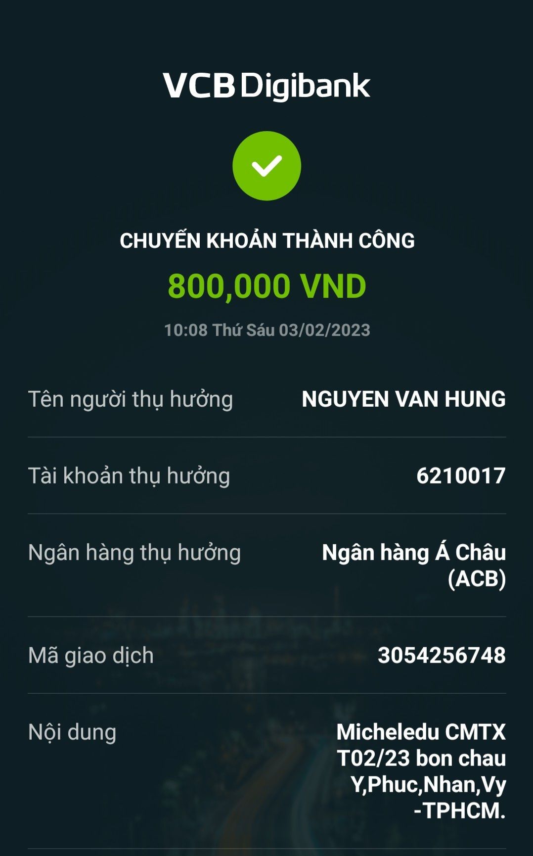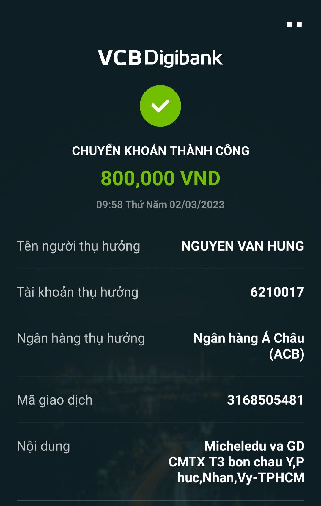 Lathuvang đã chuyển tk anh Hùng CMTX T3/23 bốn cháu Ý, Phúc,Nhân,Vy của Michele_du và GĐ.