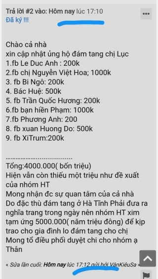 Nhóm HT xin đề xuất hõi trợ 5.000.000₫ để cùng các đoàn thể và con gái chị lo cho chi một đám tang tử tế