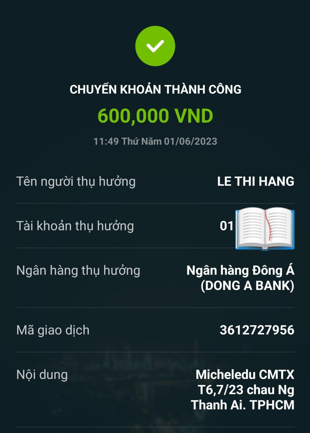 Lathuvang đã trung chuyển TK chị Hằng 600,000đ CMTX T6,7/2022 cháu Nguyễn Thành Ái của chị Michele_du và GĐ.
