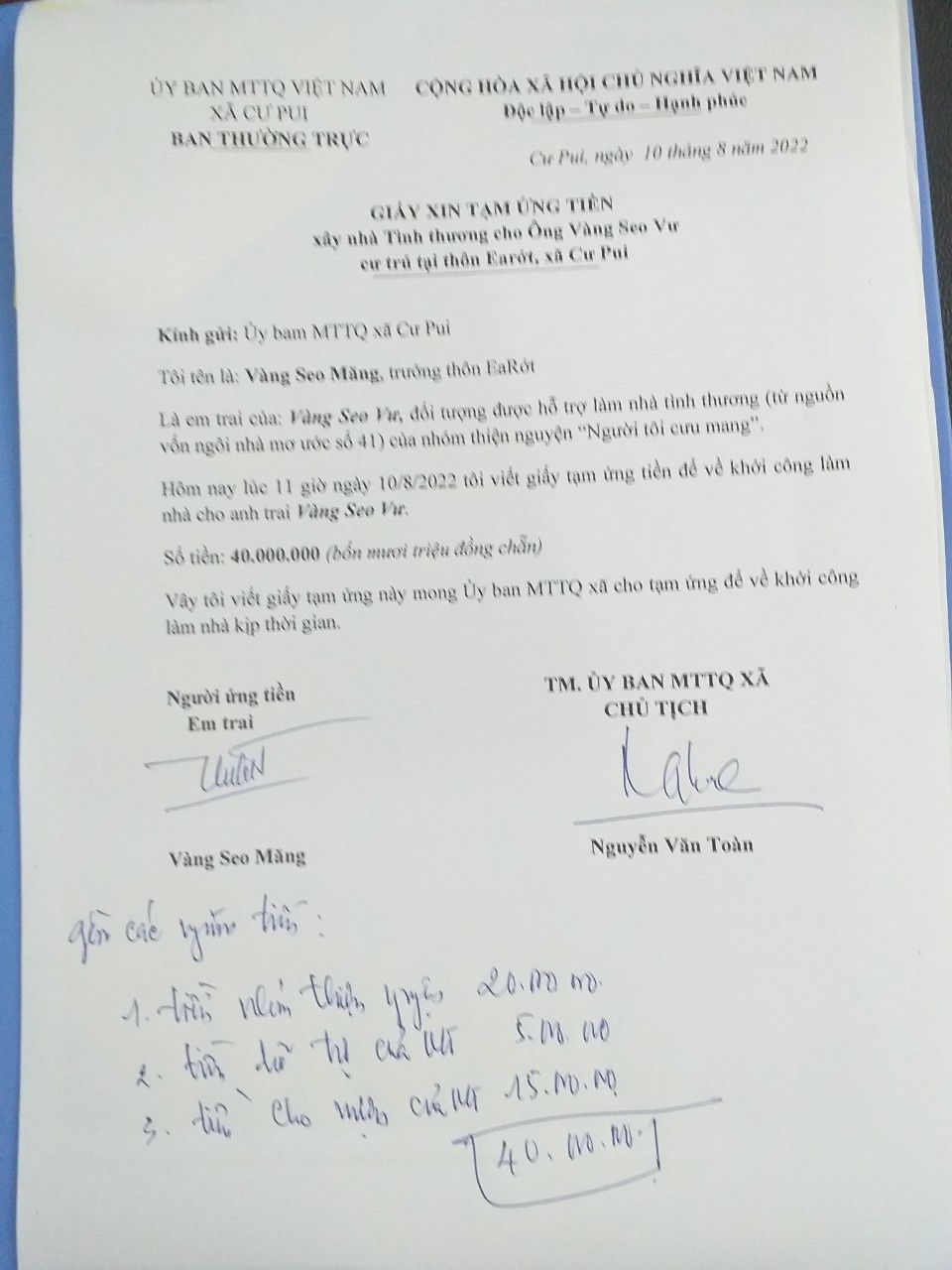 Mình đã nhận được số tiền 20.000.000đ từ NTCM, và đã chuyển số tiền này cho UBMTTQ xã Cư Pui rồi ạ. Cảm ơn cả nhà rất nhiều!