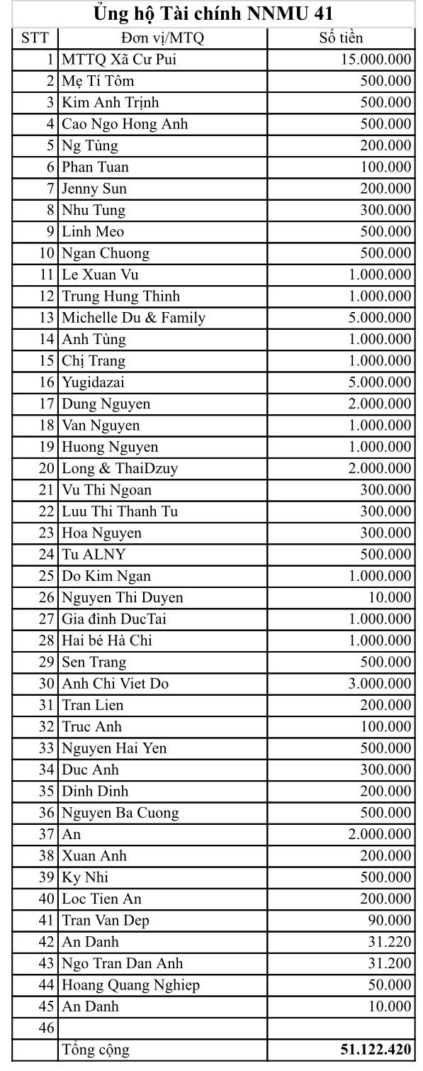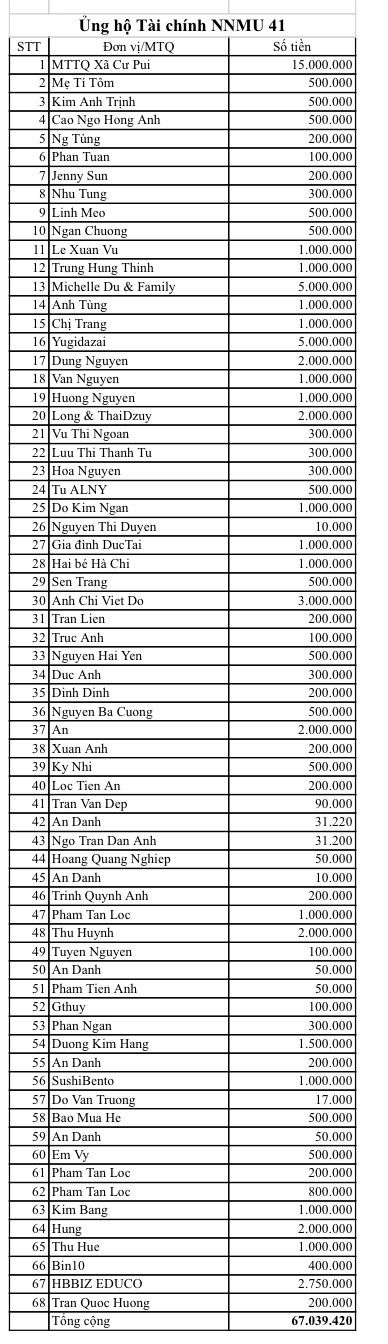 Cập nhật danh sách ủng hộ NNMU 41 đến thời điểm hiện tại.