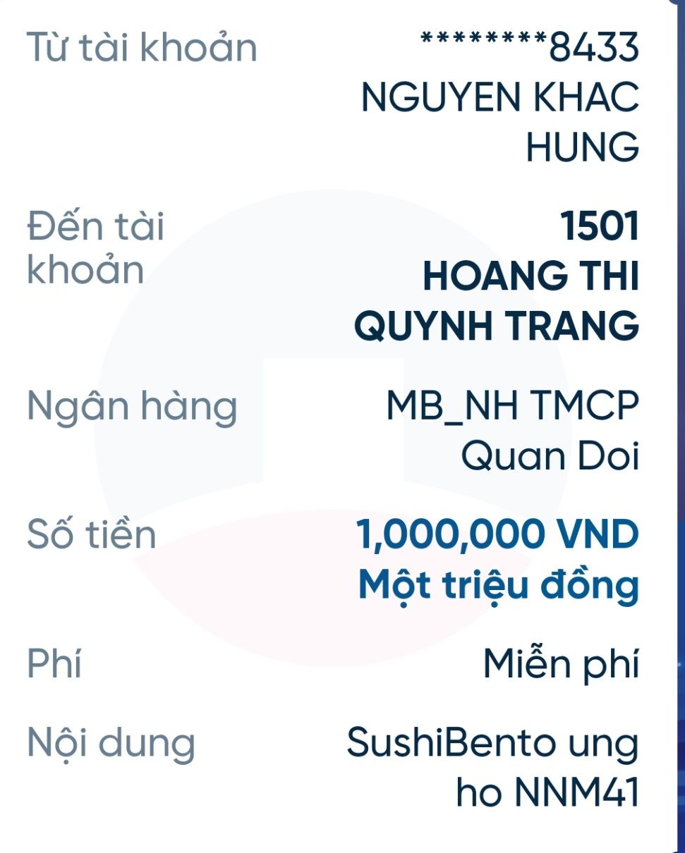 Bạn ShushiBento ủng hộ xây dựng NNMU số 41 số tiền 1,000,000₫.