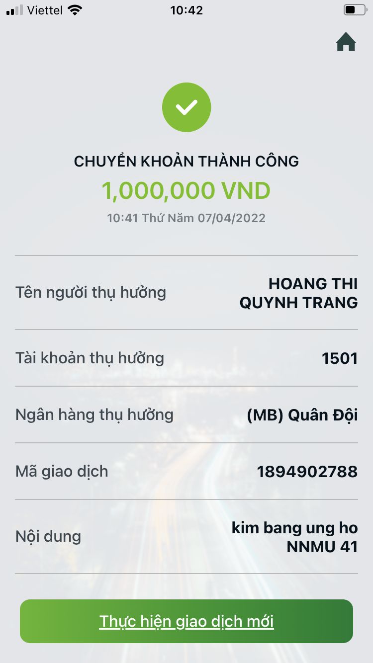 Chị Nguyễn Thị Thu Huệ ủng hộ cho NNMU số 41 số tiền 1,000,000đ. Letuantu đã nhận và chuyển vào tài khoản thủ quỹ.