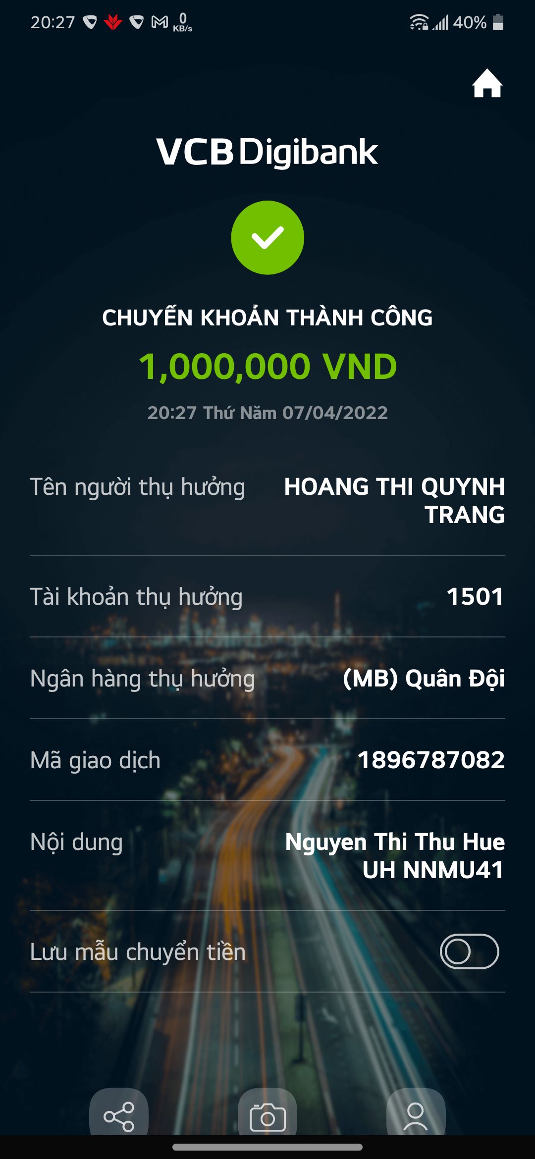 Số tiền 40 triệu đồng, trong đó NTCM đã chuyển 20tr từ tháng 4/2022.