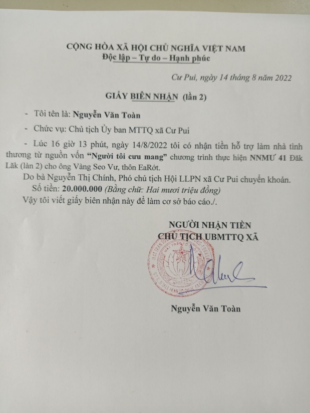Mình đã nhận được số tiền 20.000.000đ từ NTCM, và đã chuyển số tiền này cho UBMTTQ xã Cư Pui rồi ạ. Cảm ơn cả nhà rất nhiều!
