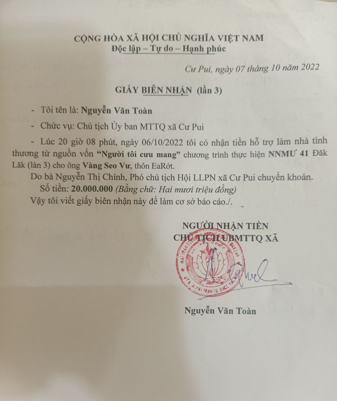 Mình đã nhận được số tiền 20 triệu từ NTCM. Mình đã chuyển số tiền này cho Chủ tịch UBMTTQ xã để chuyển đến gia đình rồi ạ.