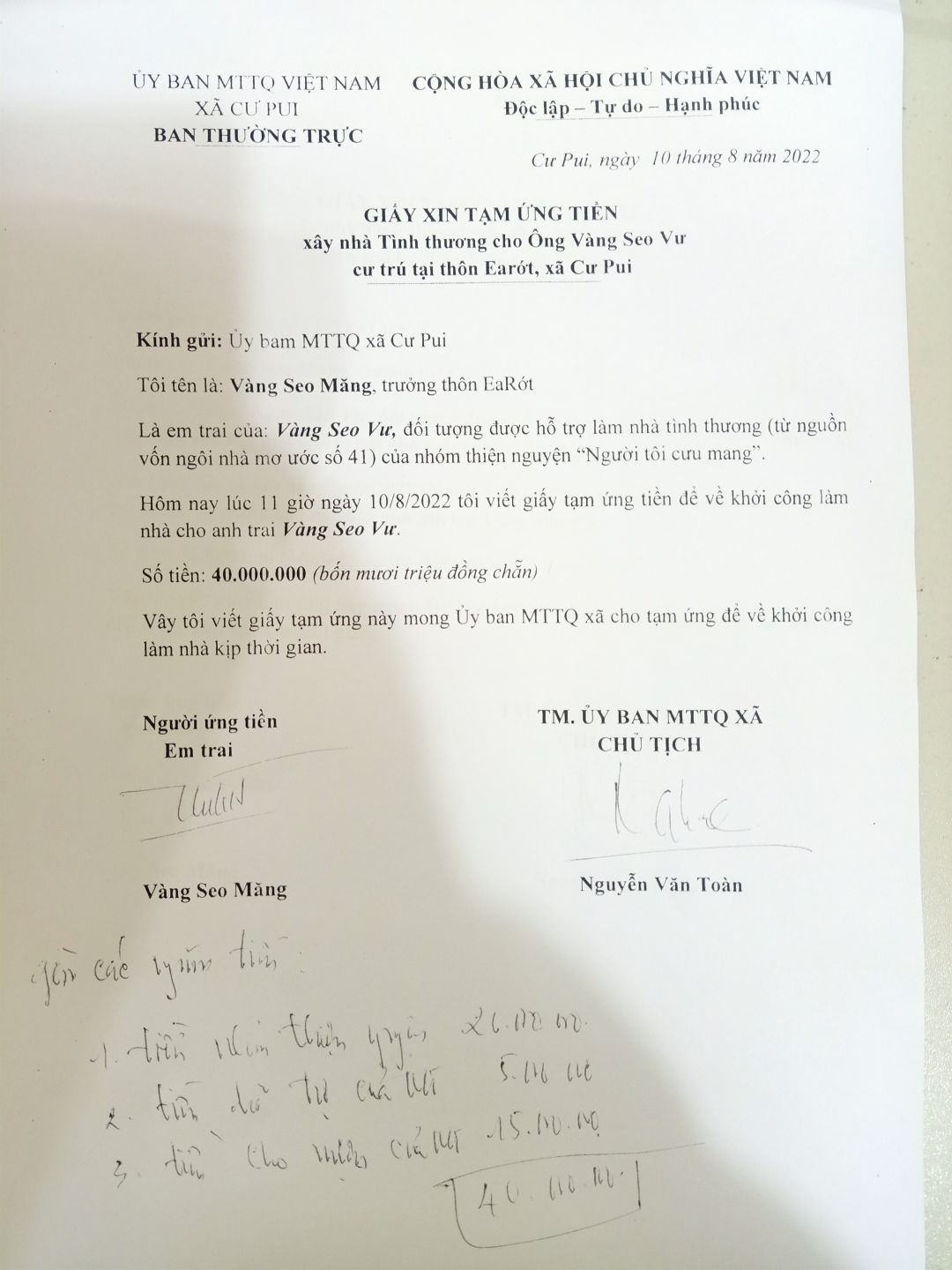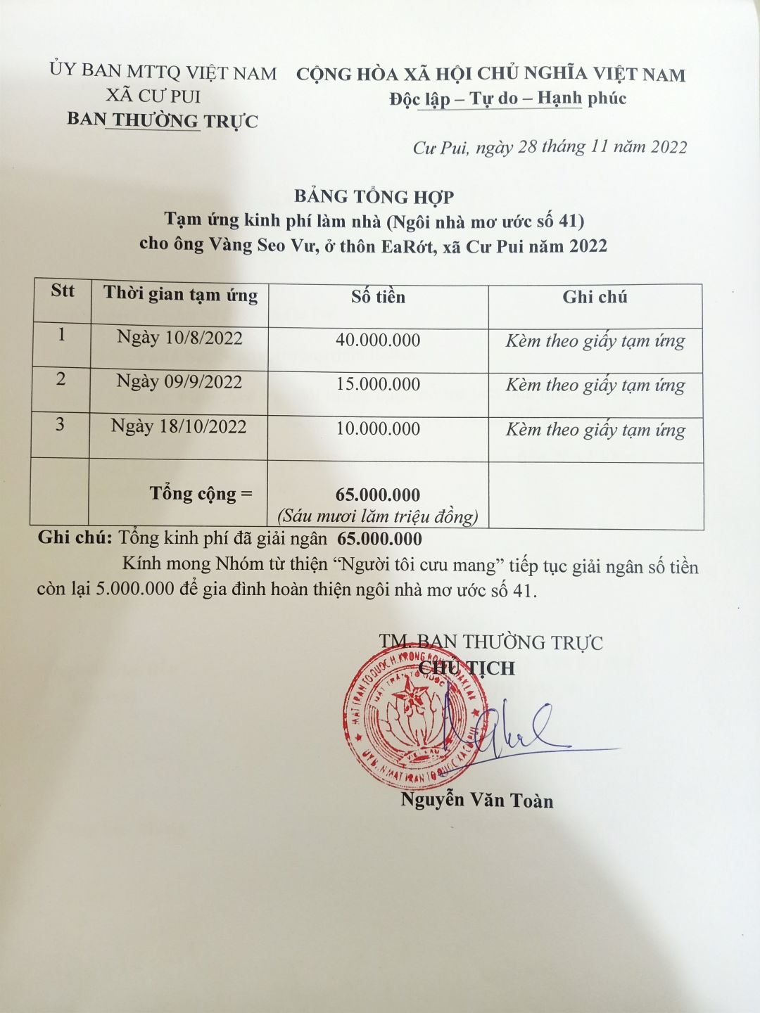 Như vậy để có thêm kinh phí mua ván và các vật liệu cần thiết, ban chỉ huy xây dựng ngôi NNMU 41 xin tạm ứng thêm 20 triệu đồng nữa để hoàn thiện. Vì vậy rất mong gia đình NTCM xem xét giải quyết để ngôi nhà sớm hoàn thiện trước mùa mưa bão sắp tới. Xin trân trọng cảm ơn